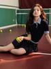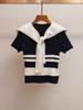 Top de punto ajustado de manga corta con contraste y cuello azul marino, estilo preppy elegante para mujer, reduce la edad, de Shenzhen Nanyou