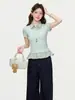 Camiseta de Manga Corta con Hombro Normal, Estampado a Cuadros tipo Patchwork, Falso Dos Piezas, Color Verde, Para Mujer, Novedad Verano 2026, Cuello con Volante, Corte Ajustado