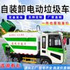 Camión de basura eléctrico con cubo colgante, camión de basura con plataforma trasera y volquete autocargable.