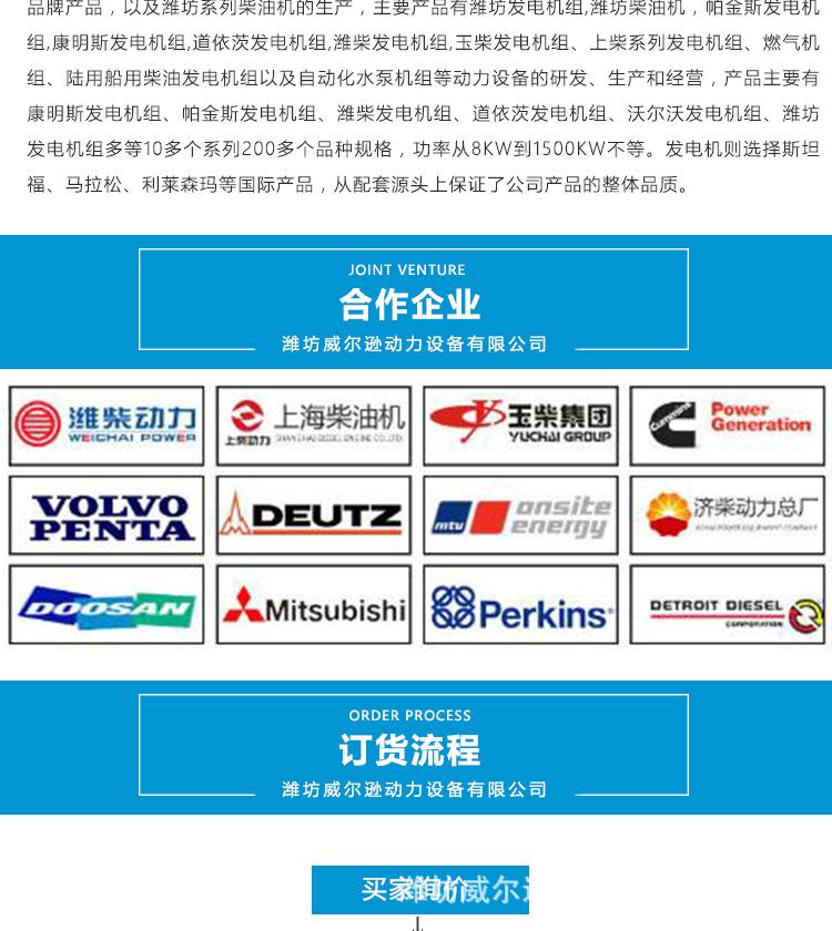 Weifang Wilson Power Equipment Co., Ltd. está localizada no distrito norte da cidade de Anqiu, cidade de Weifang, província de Shandong. É especializada na produção de produtos de marca de geradores domésticos de médio a alto padrão e motores diesel da série Weifang. Seus principais produtos incluem grupos geradores Weifang, motores diesel Weifang e P&D de geração de energia Perkins, produção e operação de equipamentos de energia, como grupos geradores Cummins, grupos geradores Deutz, grupos geradores Weichai, grupos geradores Yuchai, grupos geradores da série Shangchai, grupos geradores a gás , grupos geradores marítimos a diesel terrestres e unidades automatizadas de bomba de água. Os principais produtos incluem grupos geradores Cummins, grupos geradores Perkins, grupos geradores Weichai, grupos geradores Deutz, grupos geradores Volvo, grupos geradores Weifang e muito mais, com mais de 10 séries e mais de 200 variedades e especificações, com potência variando de 8kW a 1500kW. . Para geradores, nos concentramos na escolha de produtos de marcas internacionais famosas, como Stanford, Marathon e Leroy-Somer, garantindo a qualidade geral dos produtos da empresa desde a fonte de correspondência.