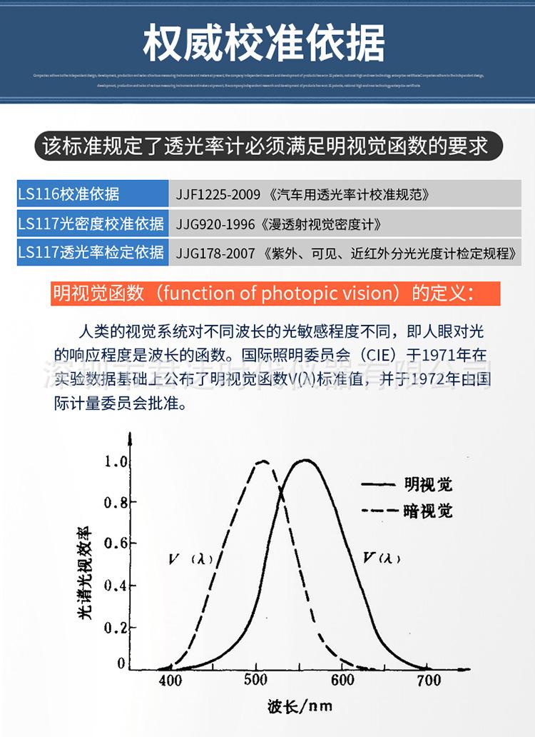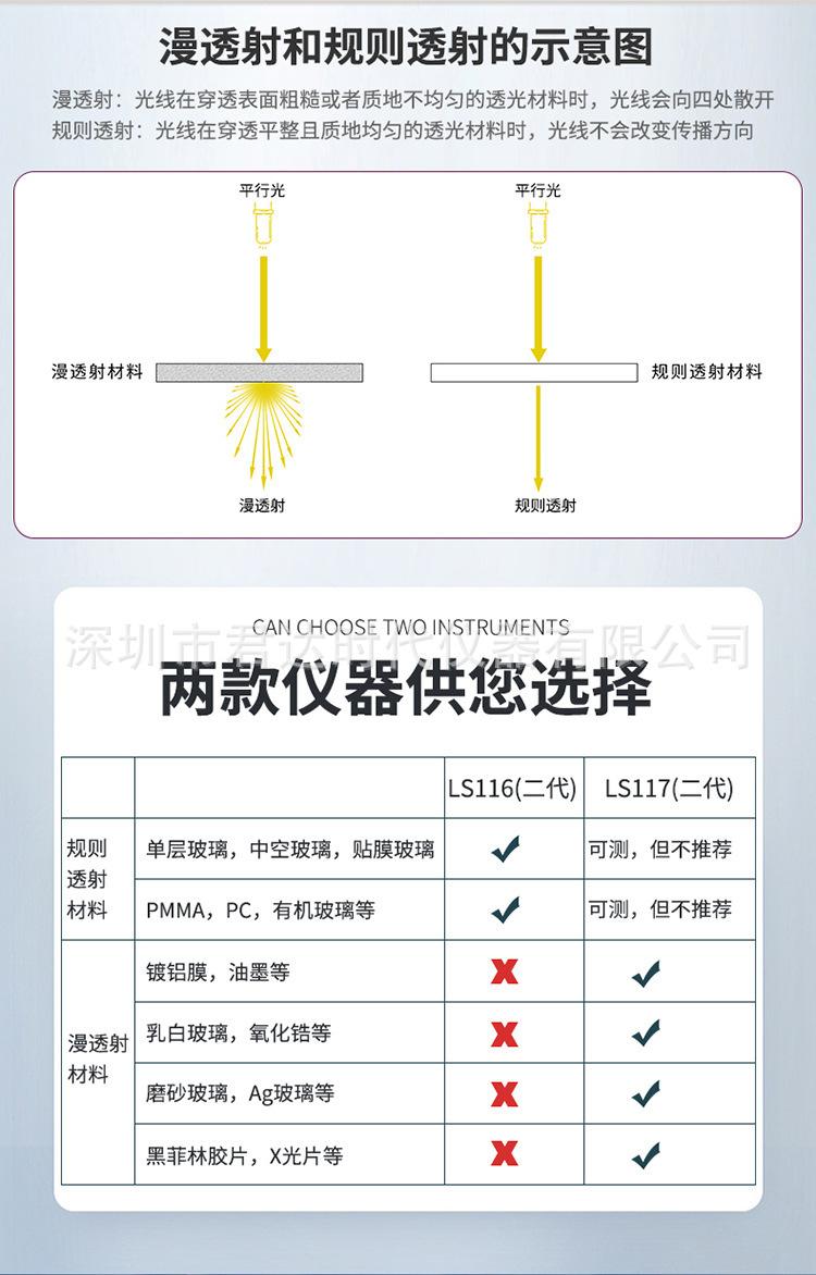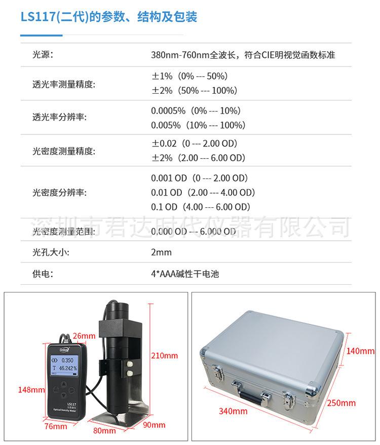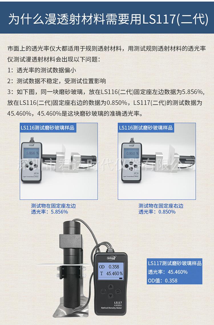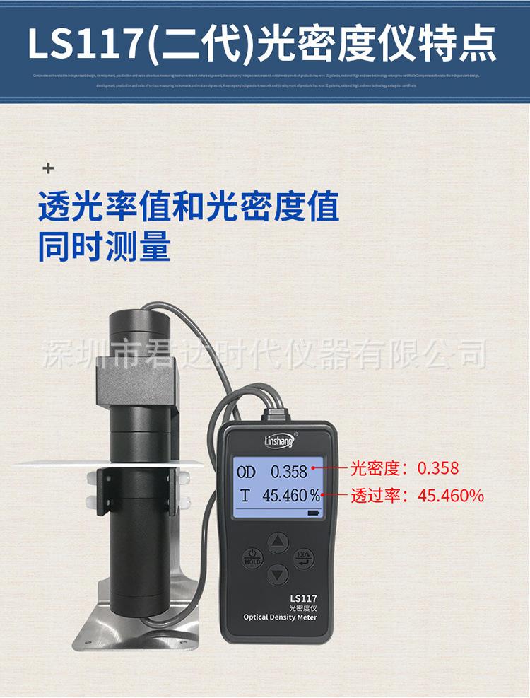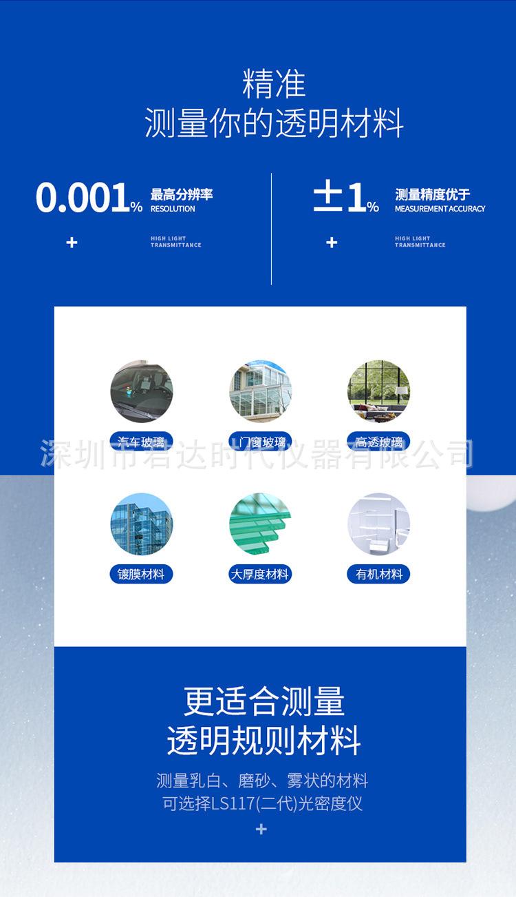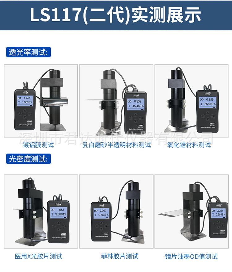 A fonte de luz do medidor de densidade óptica LS117 adota o princípio de medição de transmissão difusa. É um medidor de transmitância de material translúcido com efeito de esfera integradora. A fonte de luz está em conformidade com o padrão de função fotópica CIE e pode garantir que seja aprovada na inspeção do Instituto de Metrologia. O instrumento é adequado para testar a transmitância de luz e a densidade óptica de materiais como placas de difusão de opala, zircônia, filmes revestidos de alumínio, filmes de raios X, neblina e vidro fosco.