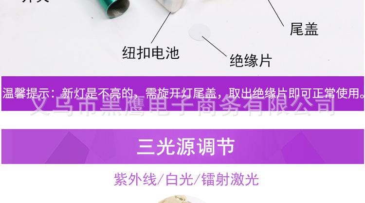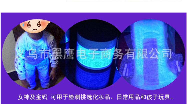 Use dois interruptores de botão e três componentes eletrônicos AG13. A parte frontal pode iluminar a fluorescência clara do RMB e também pode iluminar o fio dourado na parte de trás do RMB. Não há marca d'água ou a marca d'água está borrada e as linhas no verso não brilharão. É um bom ajudante para todos identificarem RMB autênticos e falsos. É compacto, fácil de transportar e prático. É um produto eletrônico para seu uso diário!