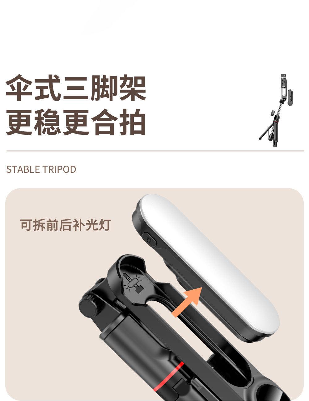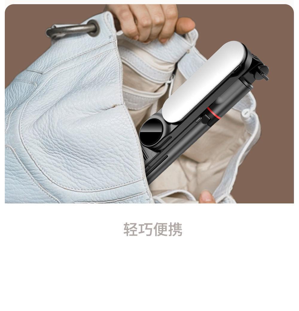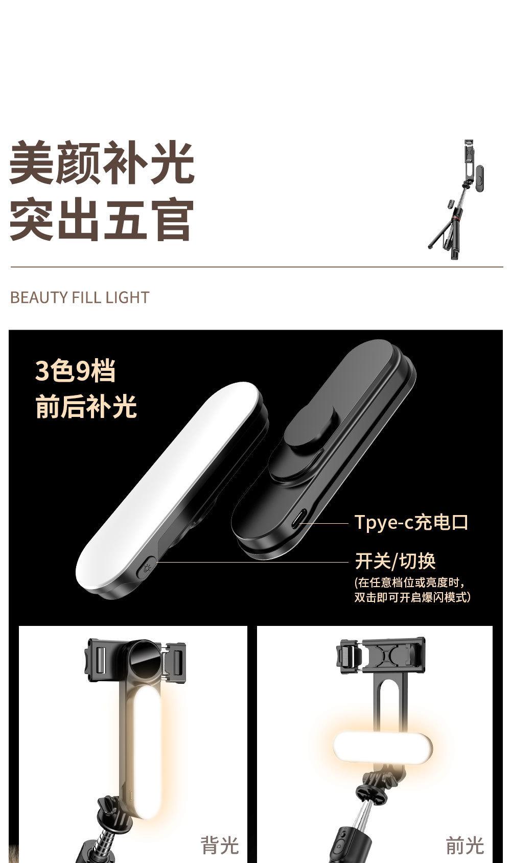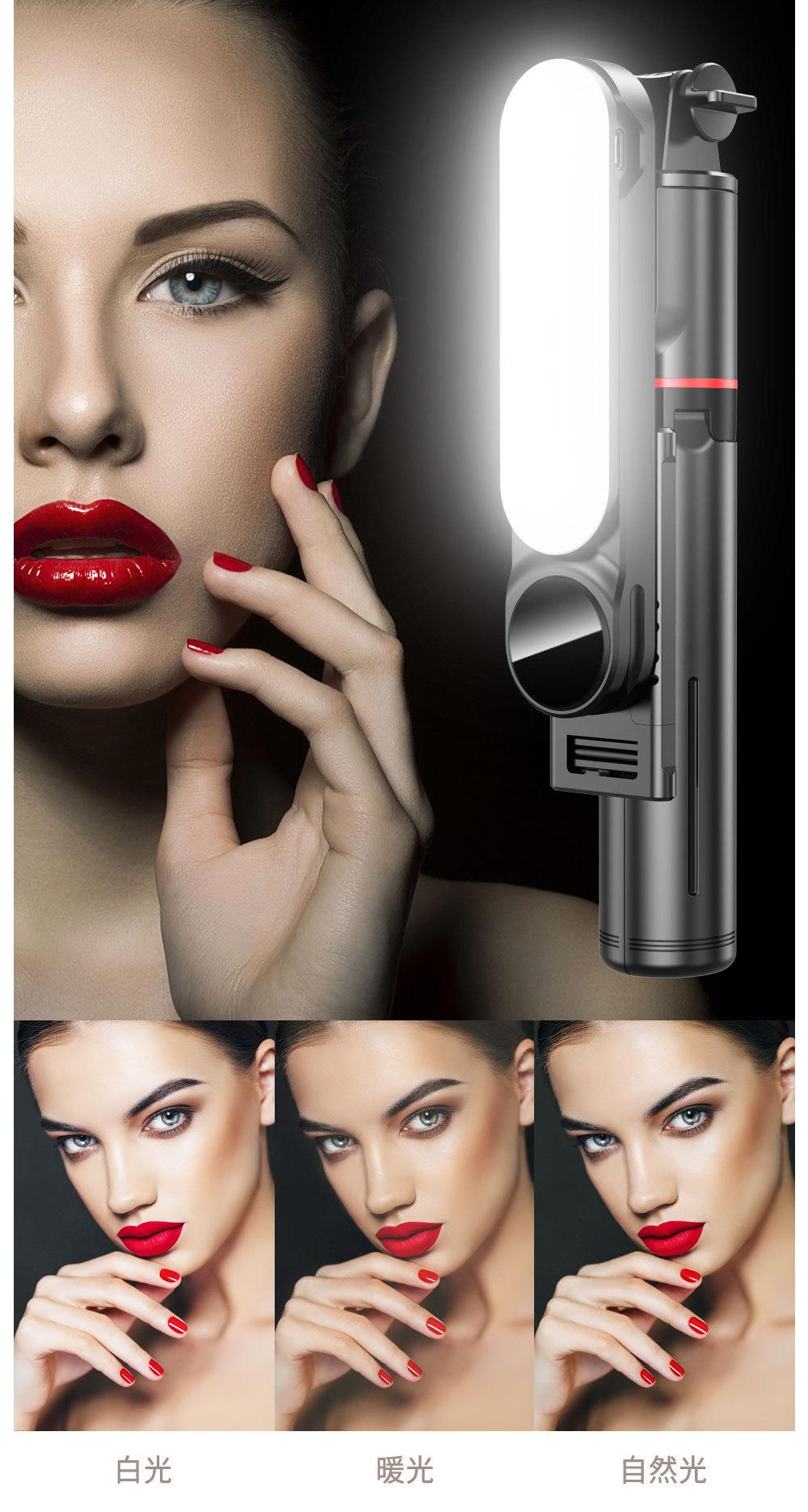 1. Viene con luz de relleno doble desmontable + 9 posiciones (tres temperaturas de color) 2. Soporte estructural estable tipo paraguas 3. Barra de extensión de 1070 mm 4. Trípode reforzado + nuevo Selfie Bluetooth; 5. La rotación de 360° admite disparos horizontales y verticales; 6. Android e iOS son compatibles. |