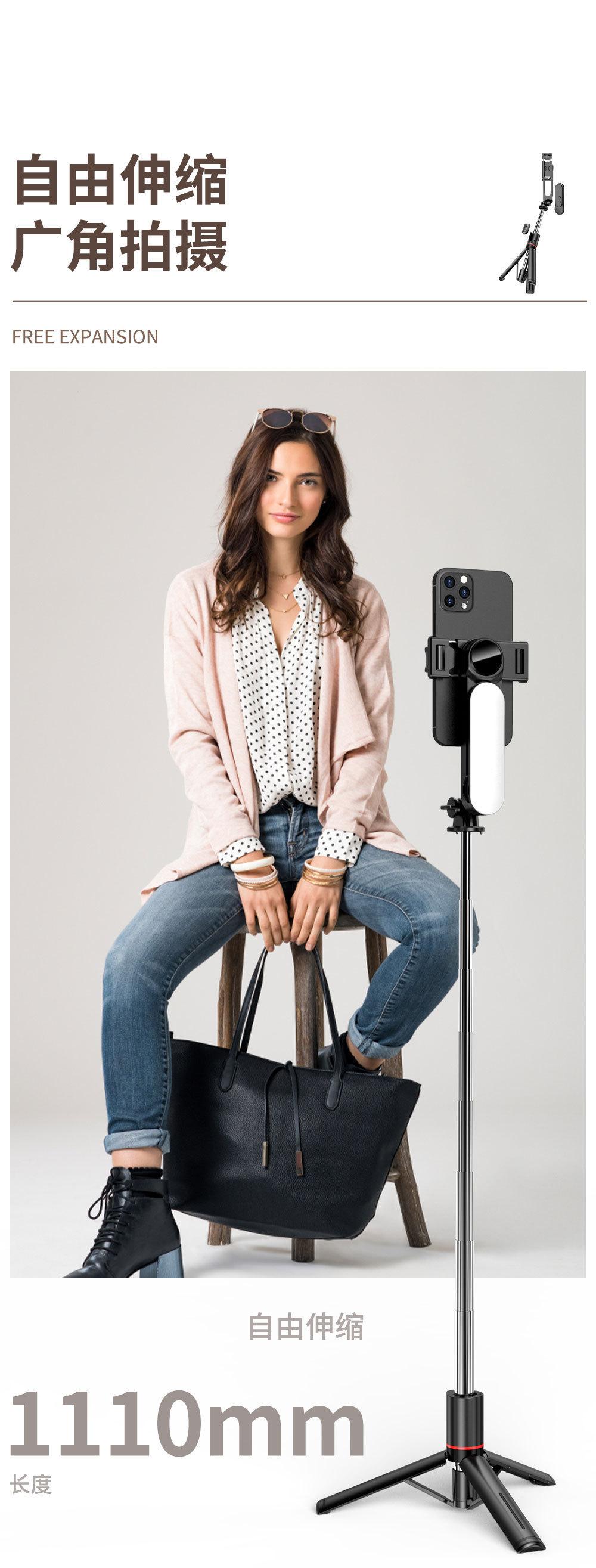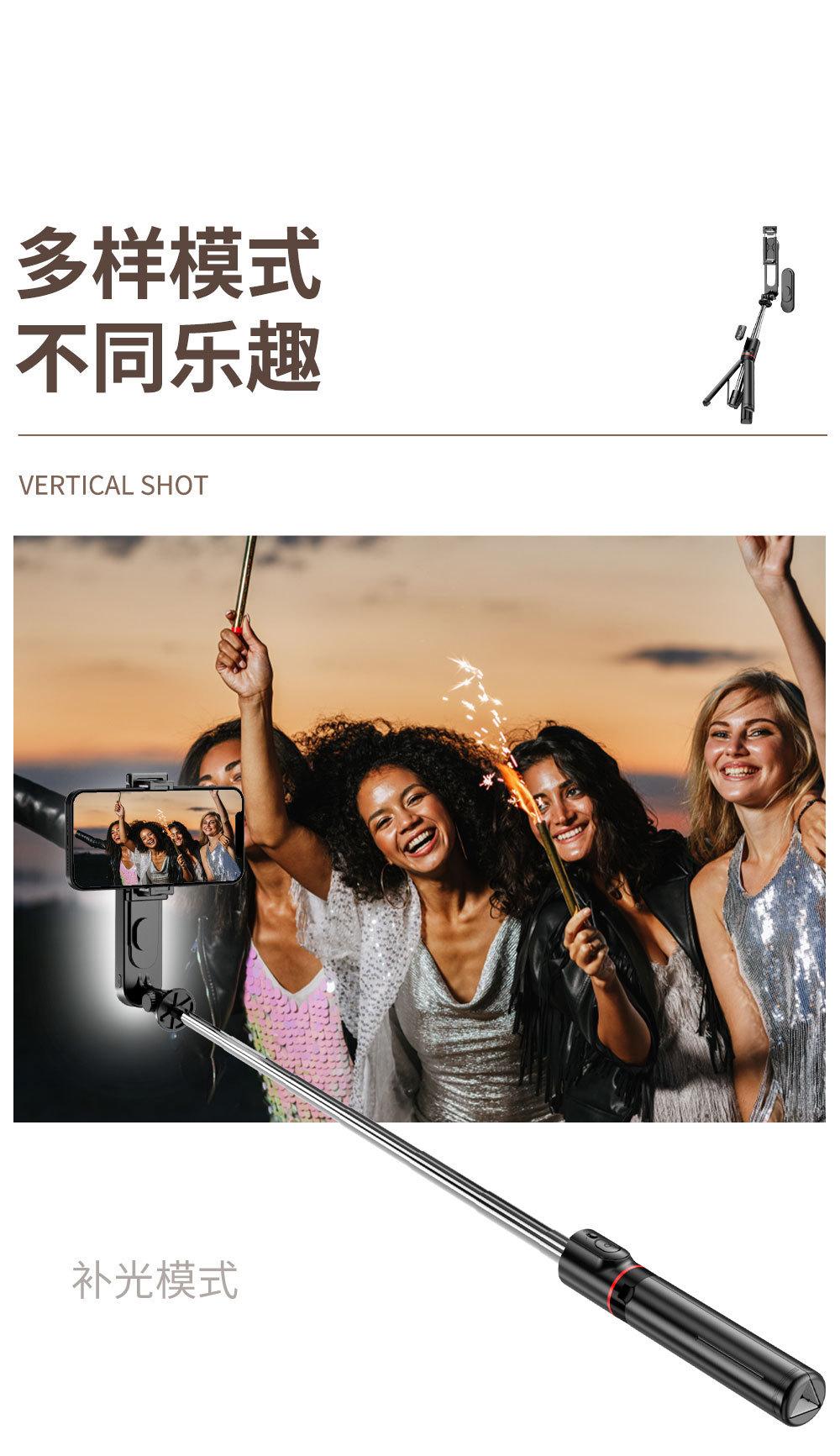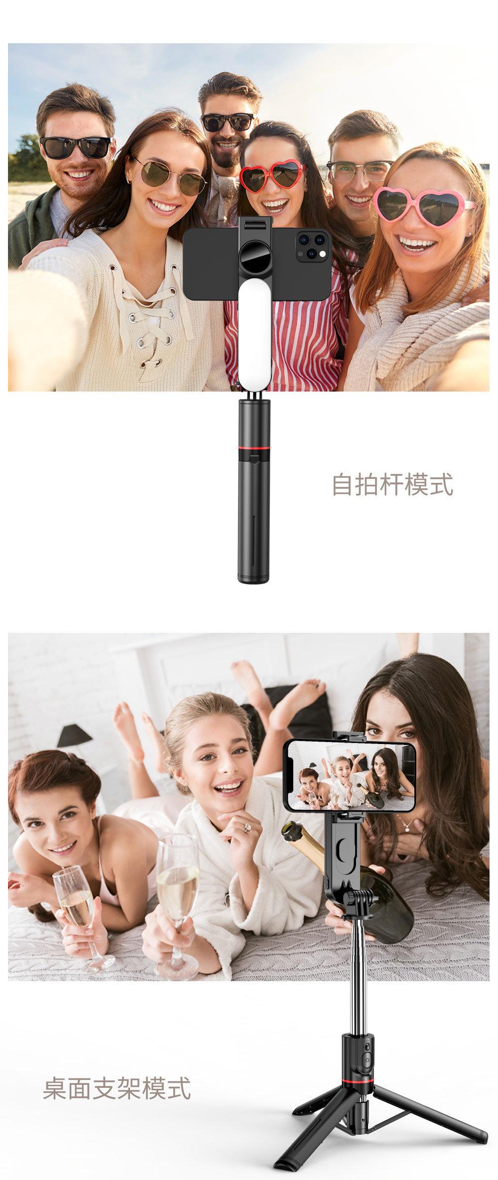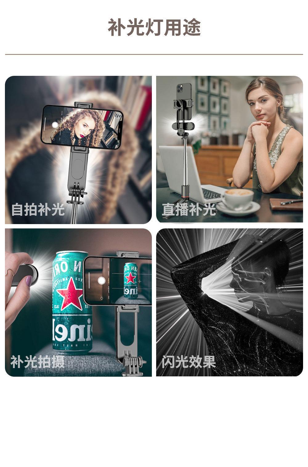 1. Viene con luz de relleno doble desmontable + 9 posiciones (tres temperaturas de color) 2. Soporte estructural estable tipo paraguas 3. Barra de extensión de 1070 mm 4. Trípode reforzado + nuevo Selfie Bluetooth; 5. La rotación de 360° admite disparos horizontales y verticales; 6. Android e iOS son compatibles. |