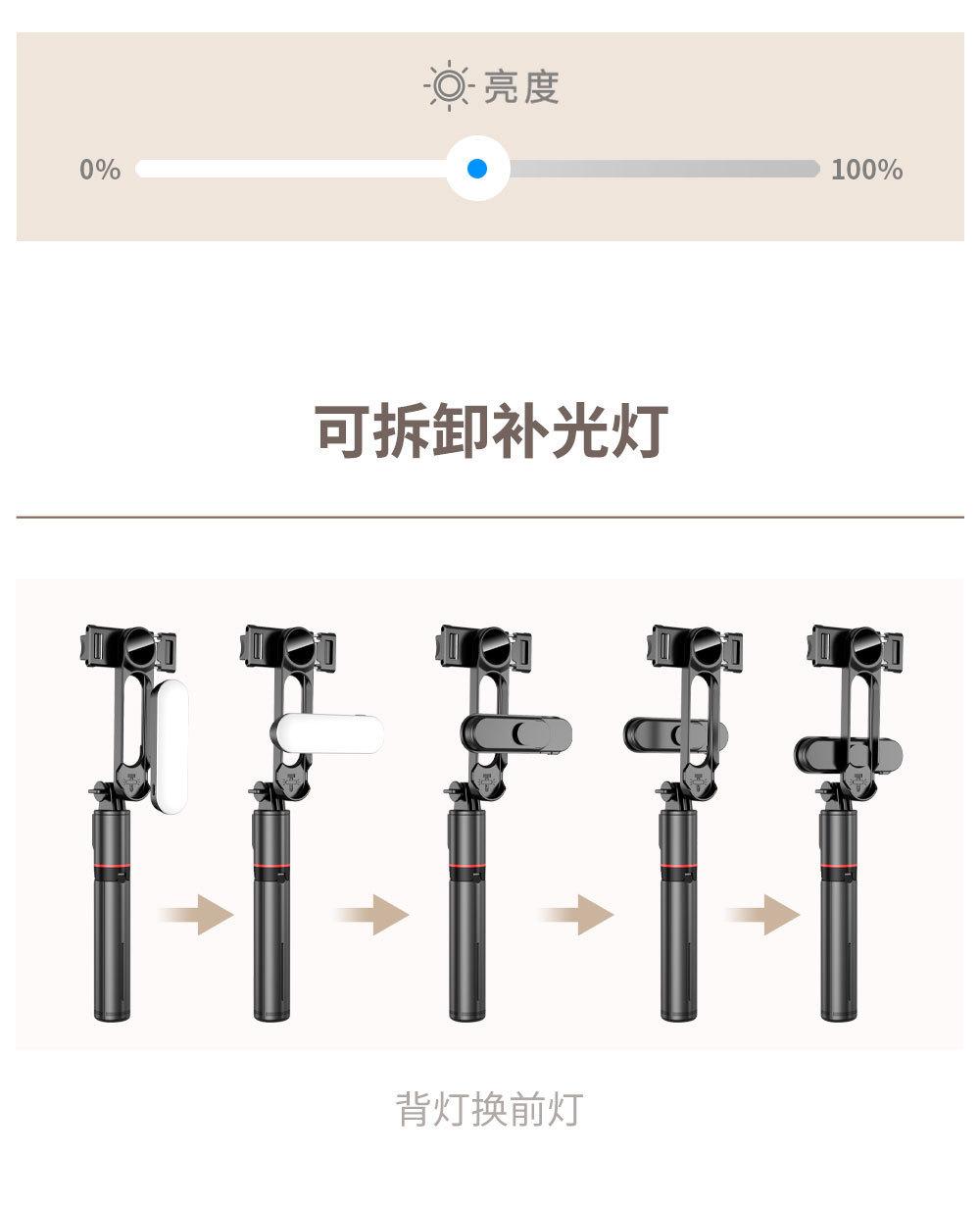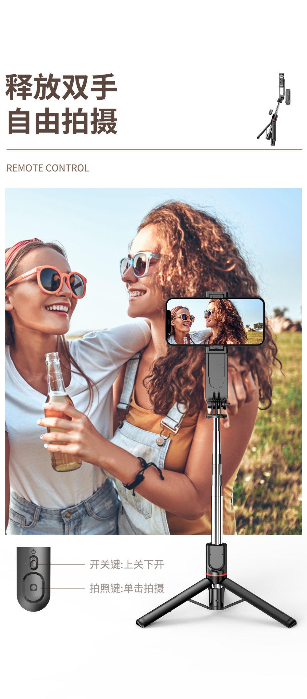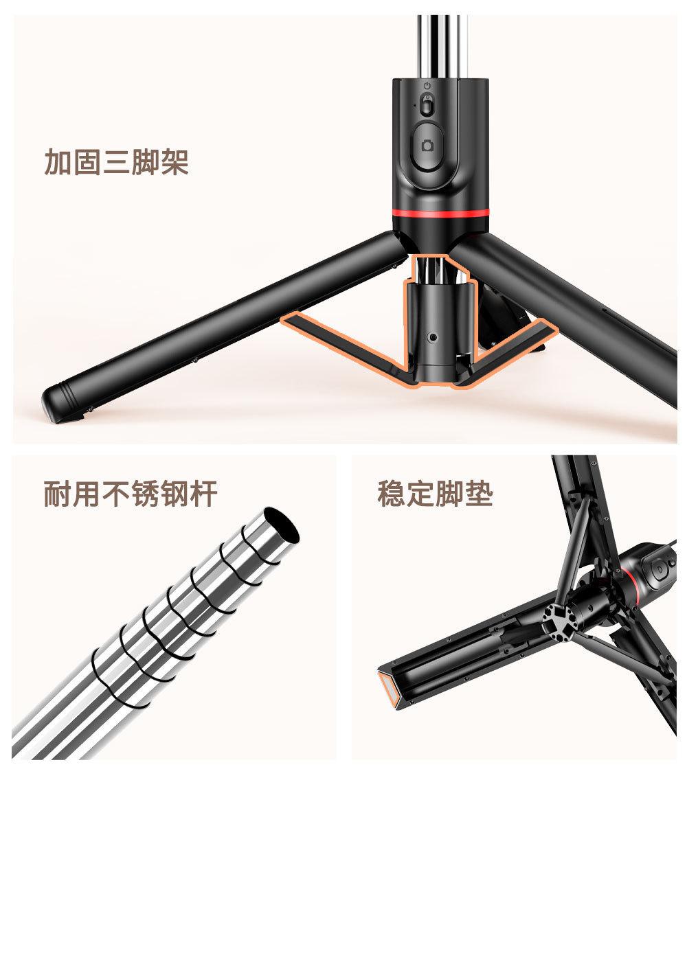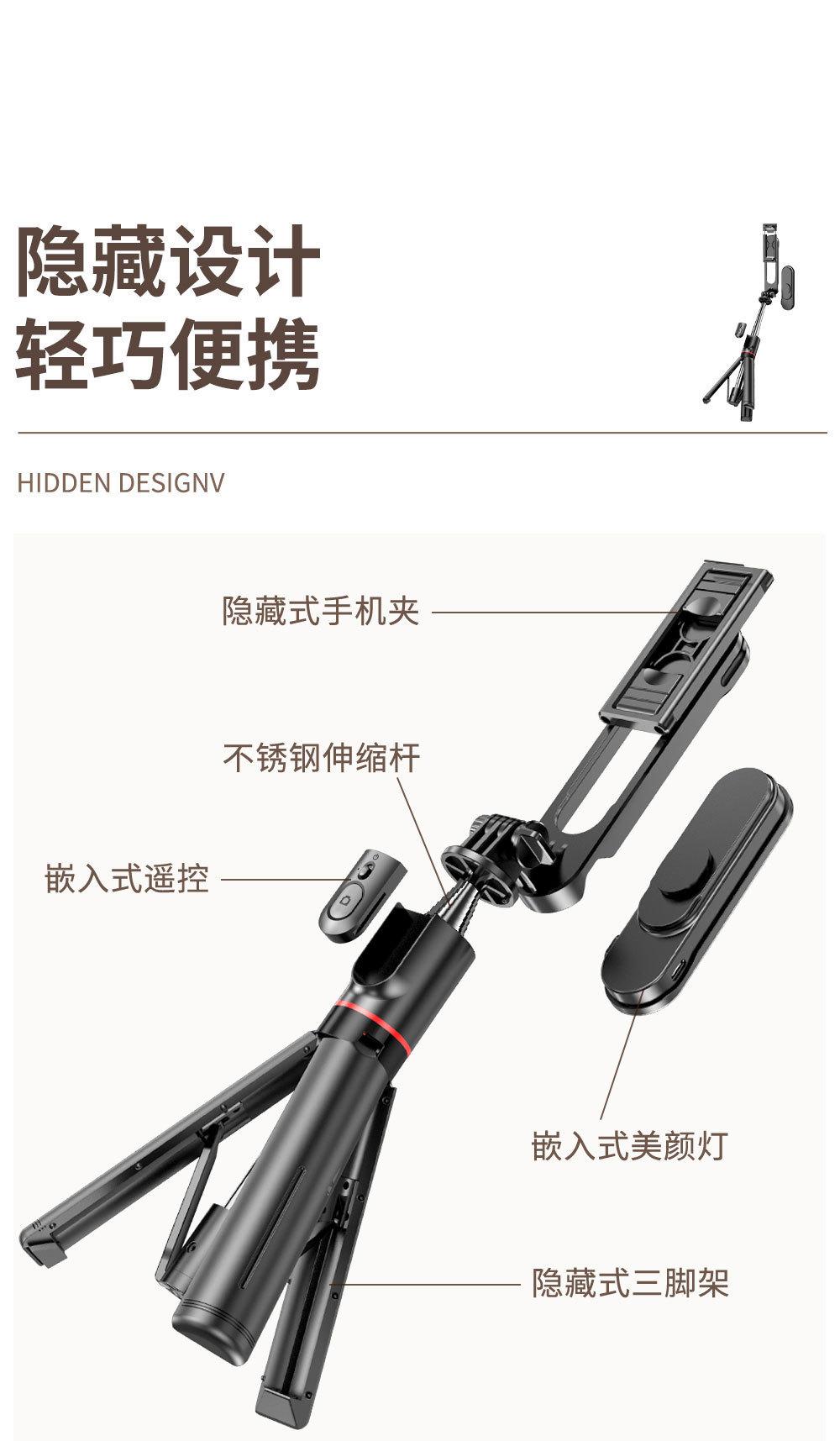 1. Viene con luz de relleno doble desmontable + 9 posiciones (tres temperaturas de color) 2. Soporte estructural estable tipo paraguas 3. Barra de extensión de 1070 mm 4. Trípode reforzado + nuevo Selfie Bluetooth; 5. La rotación de 360° admite disparos horizontales y verticales; 6. Android e iOS son compatibles. |