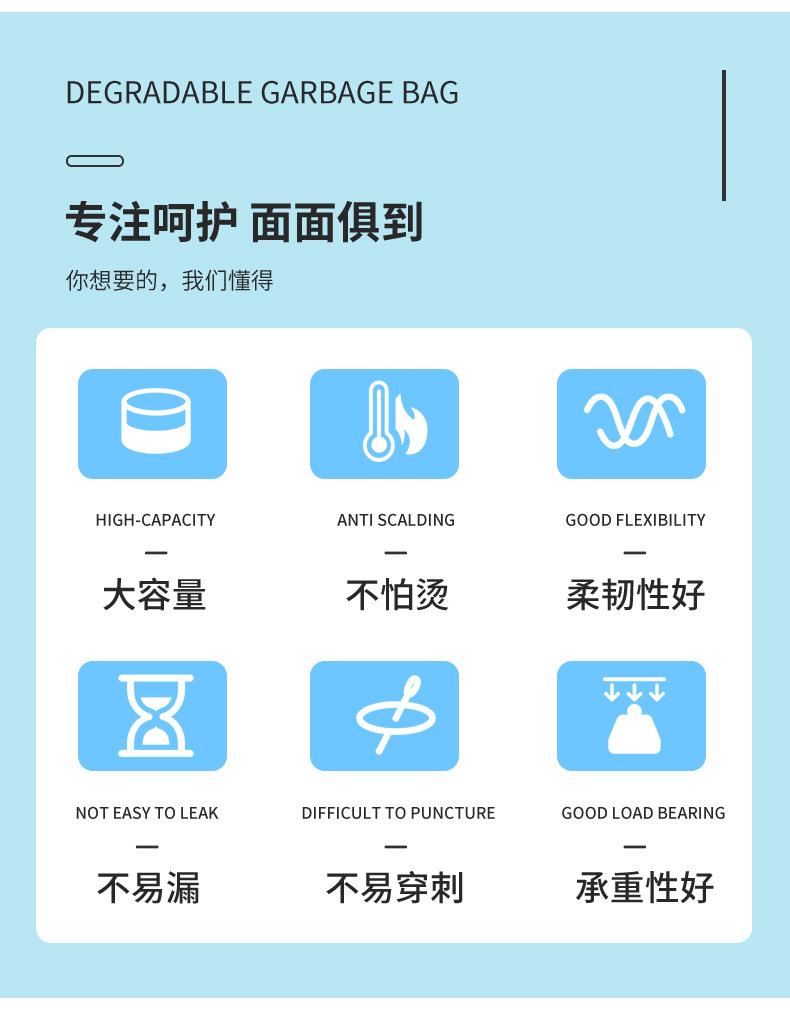Nossa empresa é uma empresa de alta tecnologia.Os sacos de lixo são feitos de novos materiais, espessados e à prova de furos, adequados para residências, hotéis, pensões, hospitais e escolas. Eles serão lançados em 2023 e exportados para Europa, América e Sudeste Asiático. O volume de exportação é de até 2 milhões de dólares americanos por ano. Clientes e amigos são bem-vindos para consultar e fazer pedidos. Um ponto de separação de lixo tornará o ambiente mais bonito.