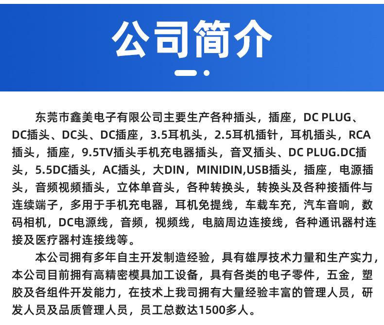 A Xinmei Company é especializada na produção de plugues para fones de ouvido, plugues para telefones celulares, plugues para computadores, bem como plugues de conversão de energia para telefones celulares e computadores, cabos de conversão, cabos de carregamento e outros produtos relacionados foram exportados para Europa, América, Japão, Coreia do Sul e no Oriente Médio e em outras partes do mundo, e goza de grande reputação na indústria!