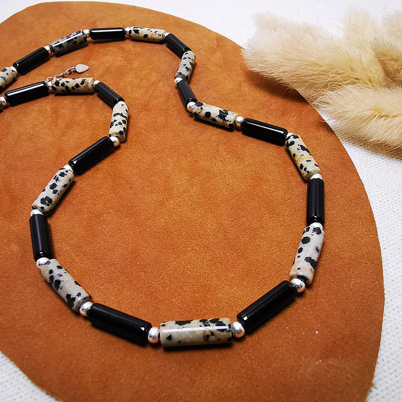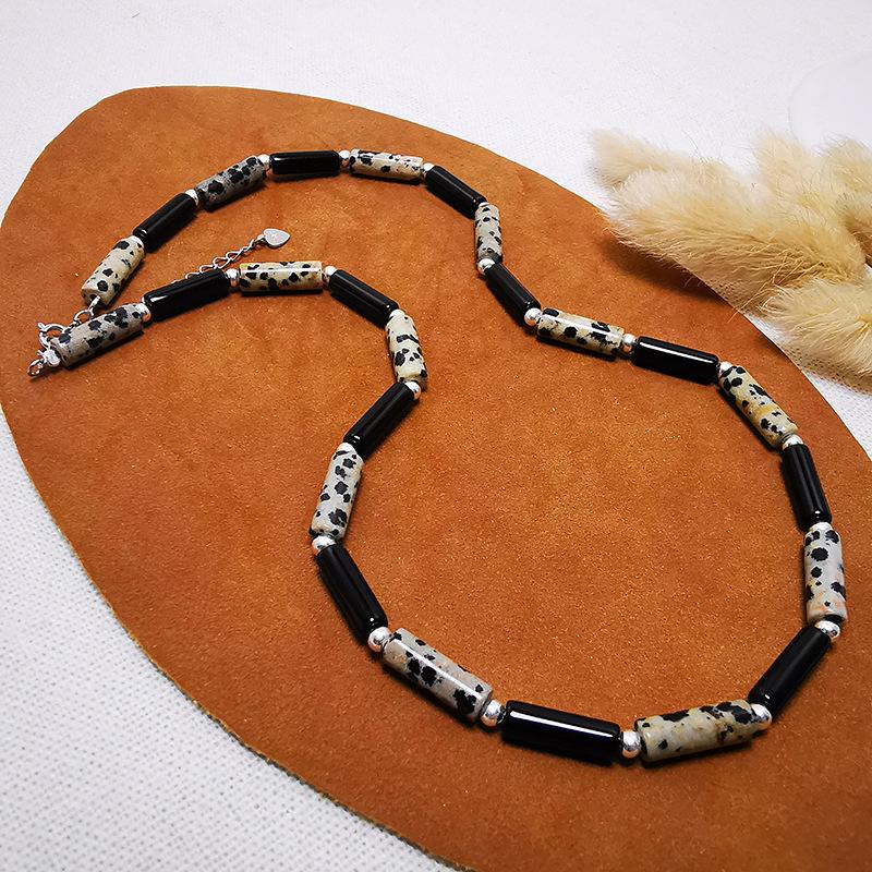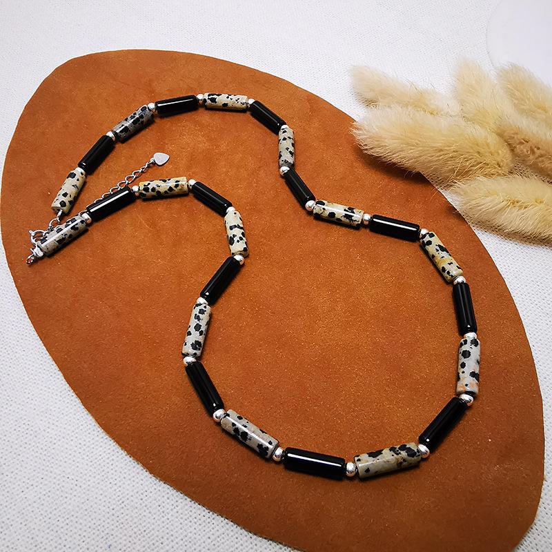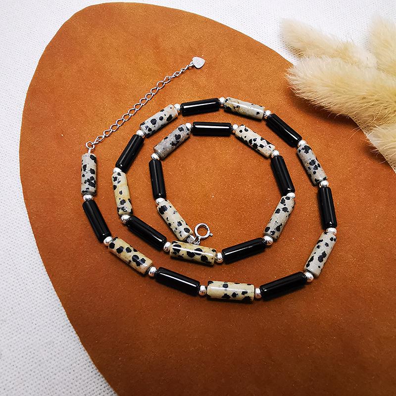 【tamanho do bebê】:Ágata preta natural/pedra salpicadaO tamanho pequeno é de cerca de 4*13mm, o diâmetro do cordão de prata é de cerca de 3mm, colarO comprimento é 40+5cm/45+5CM/50+5CM opcional, o mesmo estilo para homens e mulheres, puramente feito à mão, se precisar de outros tamanhos, entre em contato com o atendimento ao cliente para personalização.