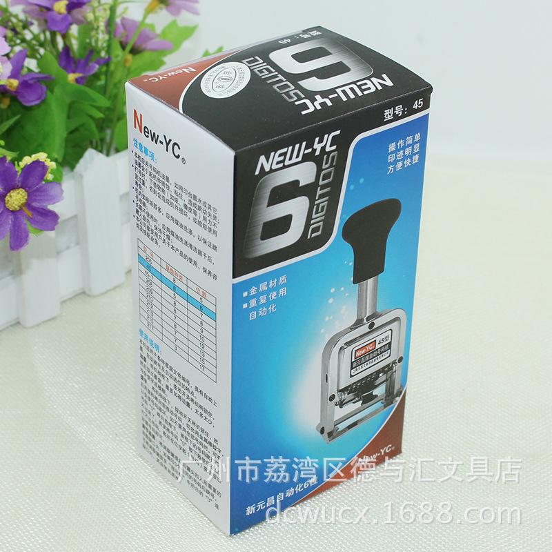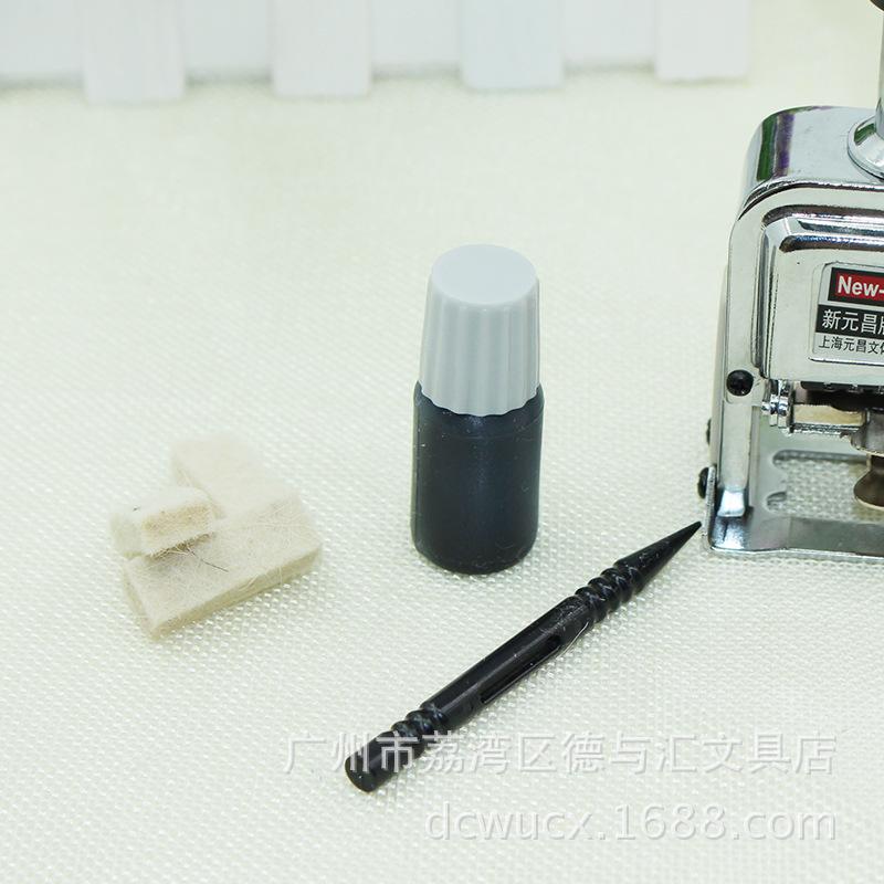 Descrição: Contém uma máquina numérica automática Yuanchang de 5 dígitos, dois pedaços de feltro, uma palheta, um frasco de tinta preta e um manual de instruções.