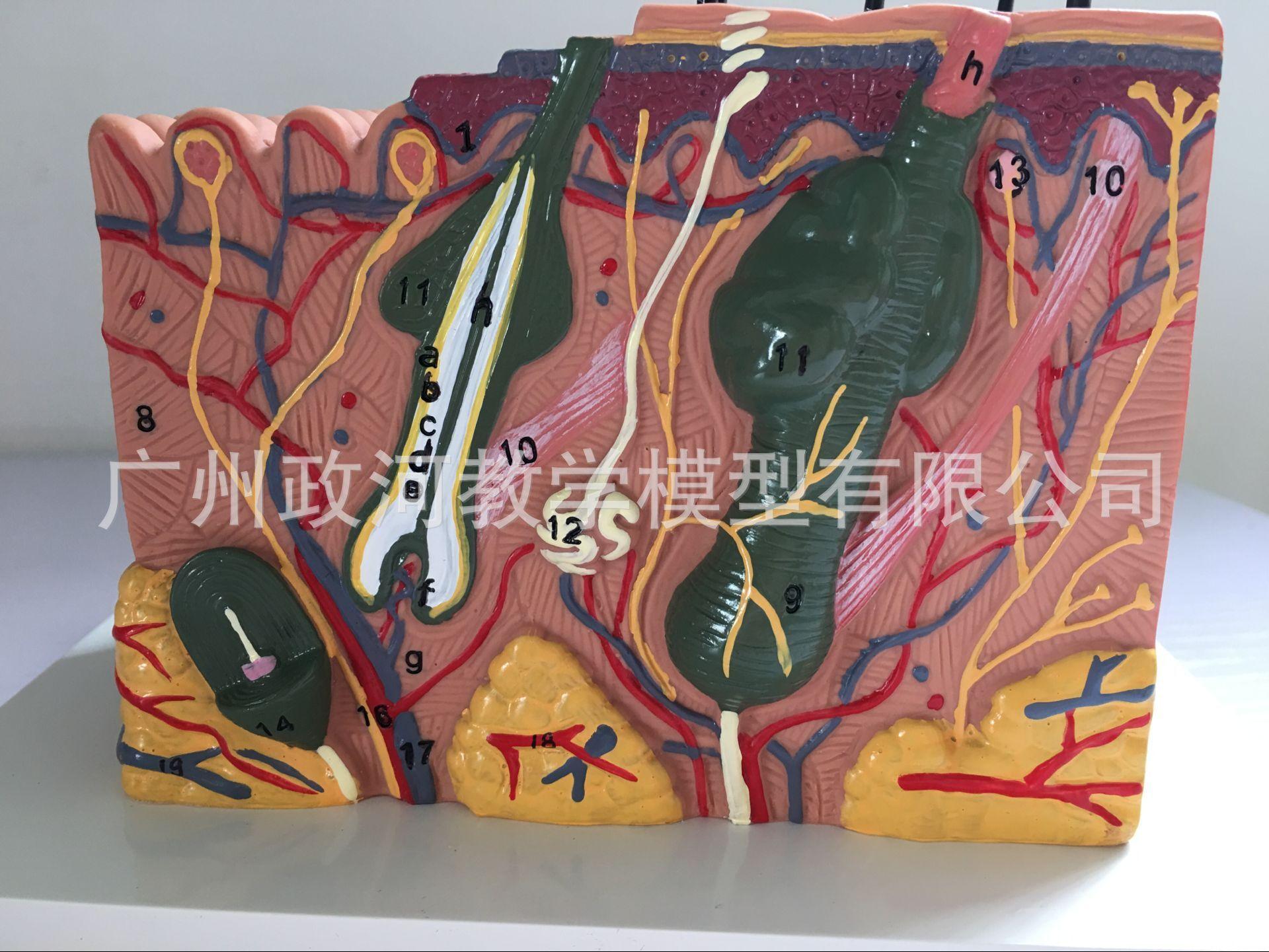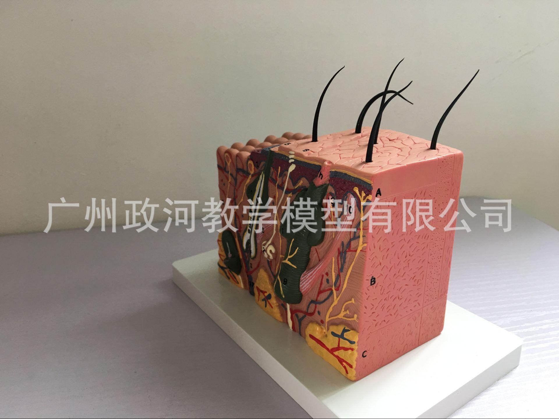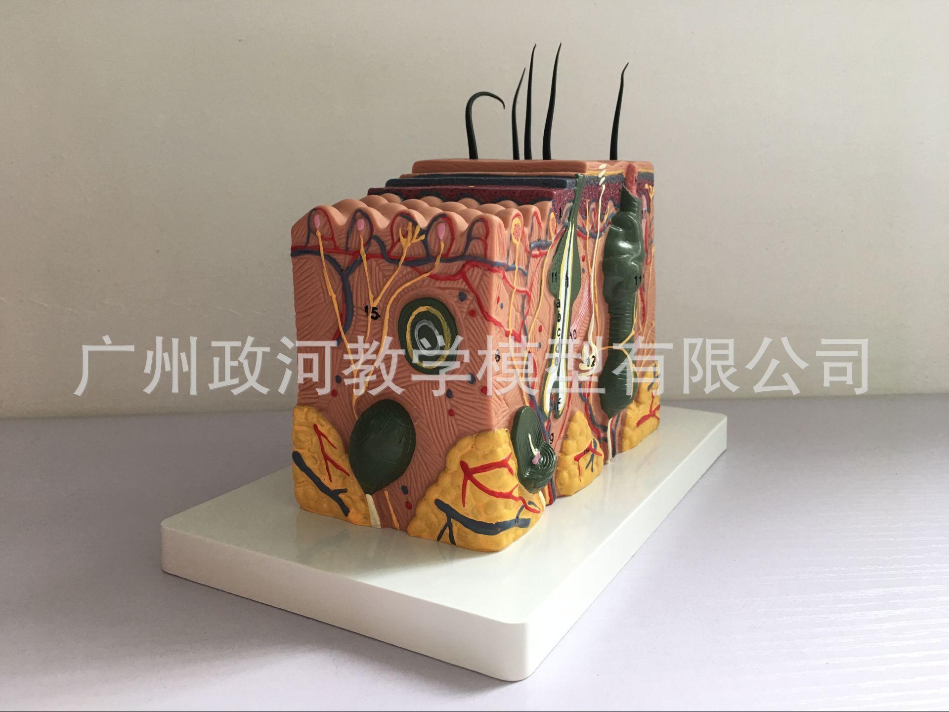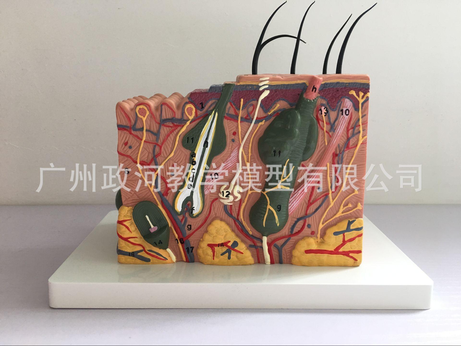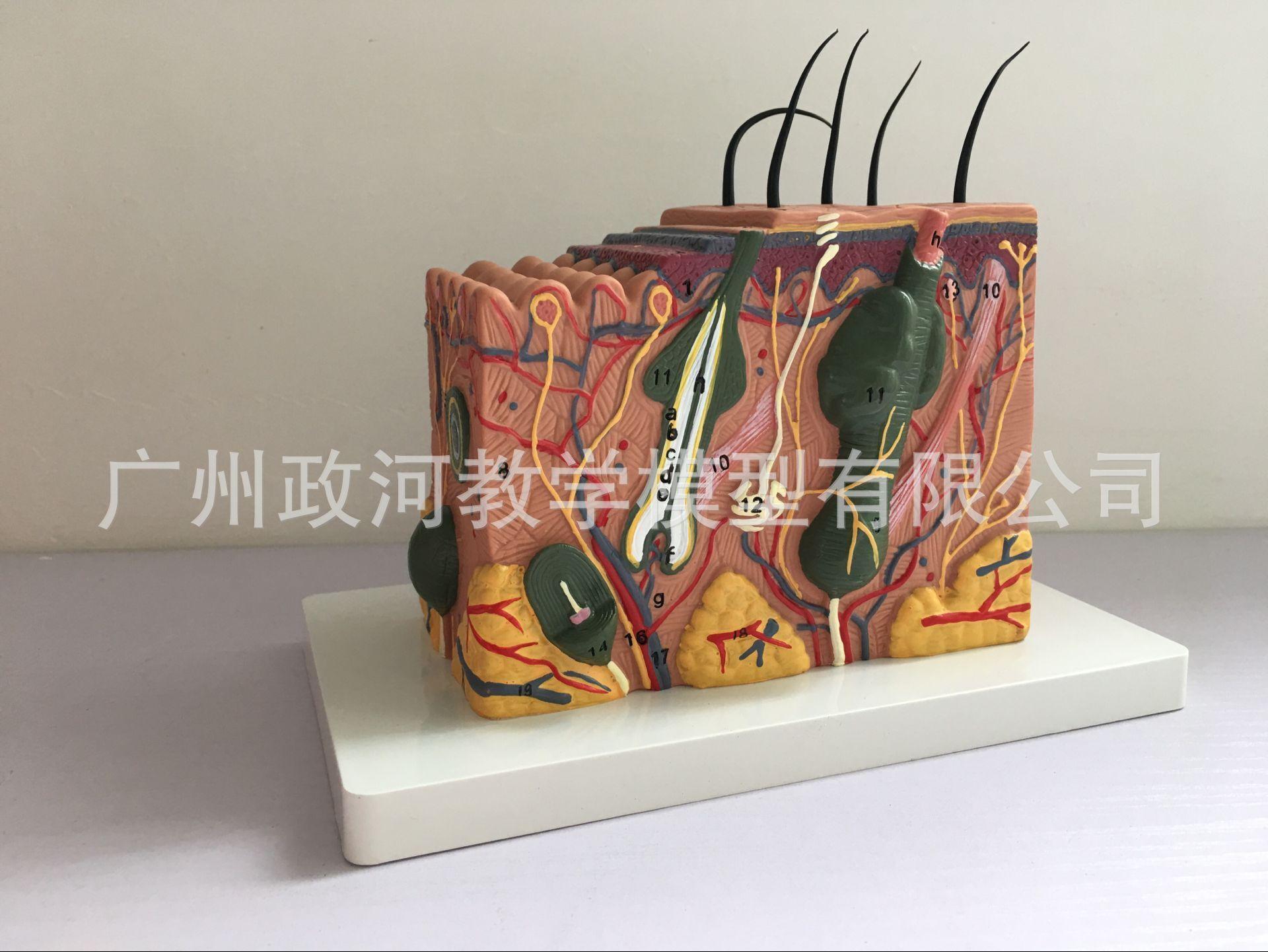 O modelo é composto por quatro partes, cada uma dividida em duas partes: a epiderme e a derme. Está conectado ao tecido profundo através do tecido subcutâneo e mostra a estrutura hierárquica do tecido da epiderme e da derme, bem como do tecido subcutâneo e dos anexos da pele (incluindo cabelos, glândulas sebáceas, glândulas sudoríparas e terminações nervosas). e outras estruturas, com um total de 25 marcas de indicação de peças. Material: material de PVC importado, tinta importada, correspondência de cores do computador