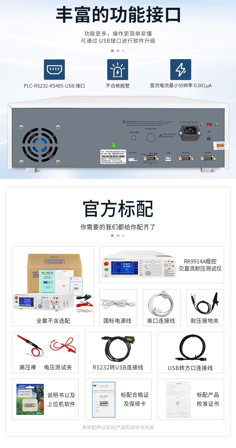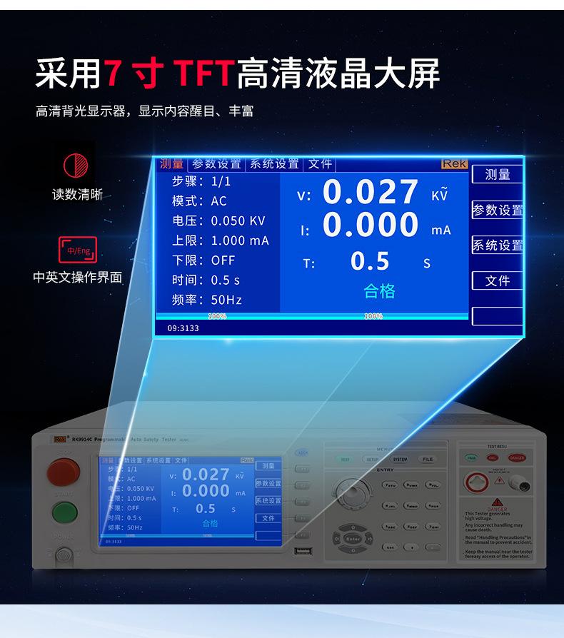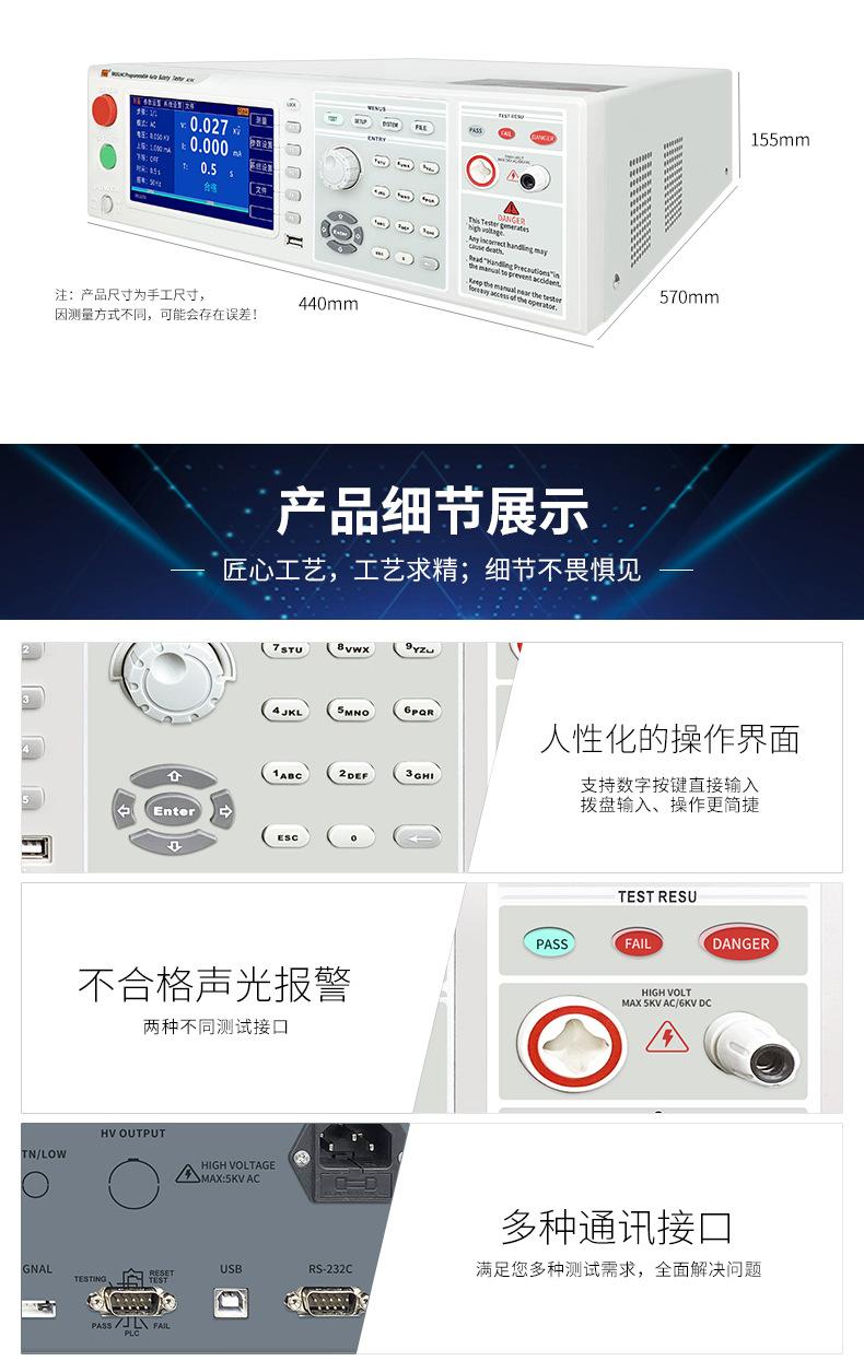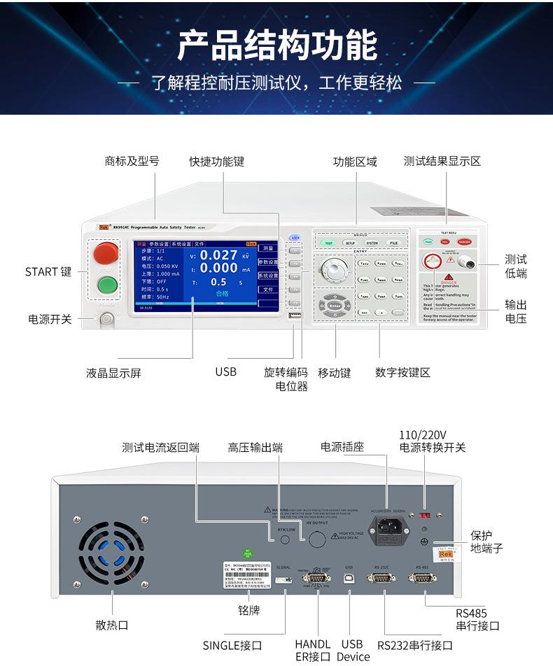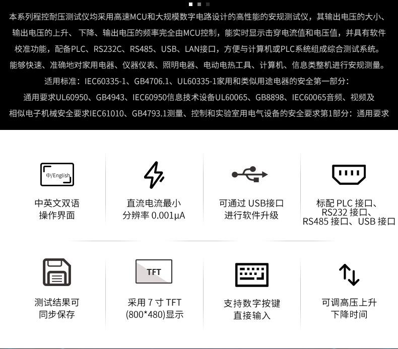 Esta série de testadores de tensão suportável controlados por programa são testadores de segurança de alto desempenho projetados com MCU de alta velocidade e circuitos digitais de grande escala. O tamanho de sua tensão de saída,O aumento, queda e frequência da tensão de saída são completamente controlados pelo MCU, que pode exibir o valor da corrente de ruptura e o valor da tensão em tempo real.Também possui função de calibração de software e está equipado com interfaces PLC, RS232C, RS485, USB e LAN para facilitar a formação de um sistema de teste abrangente com um computador ou sistema PLC;