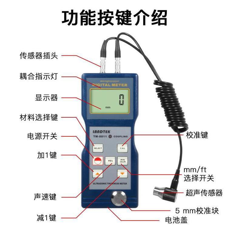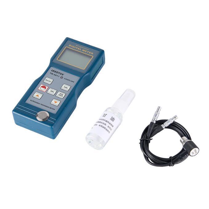 Materiales que TM-8811 puede medir: puede medir cualquier material duro, como: acero, acero fundido, aluminio, cobre, latón, zinc, vidrio de cuarzo, polietileno, cloruro de polivinilo, hierro fundido gris, hierro fundido dúctil, cerámica, plásticos y el espesor de cualquier otro buen conductor de ondas ultrasónicas.