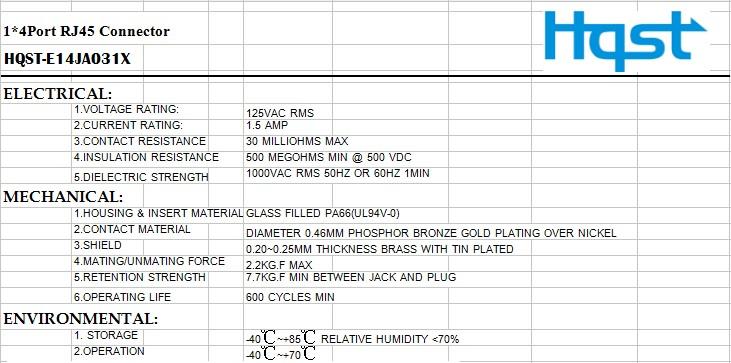 * Padrão retardador de chama para material de moldagem por injeção de corpo de soquete RJ45: nível UL-94 V-0 (método de teste de combustão UL-94, V-0 é o nível de combustão mais alto); PBT