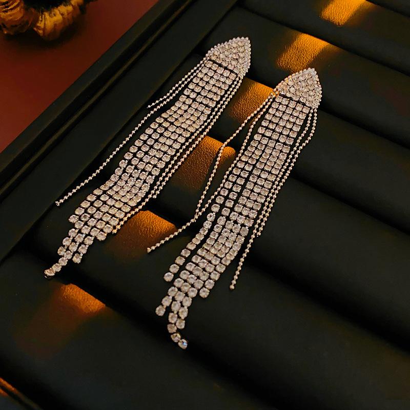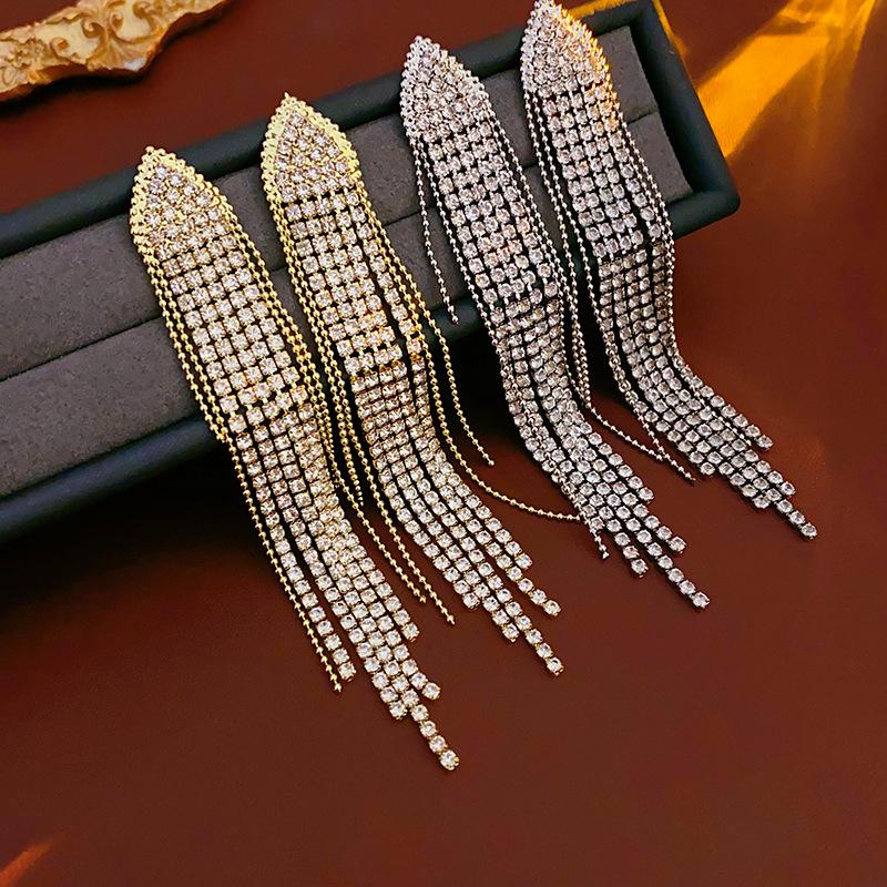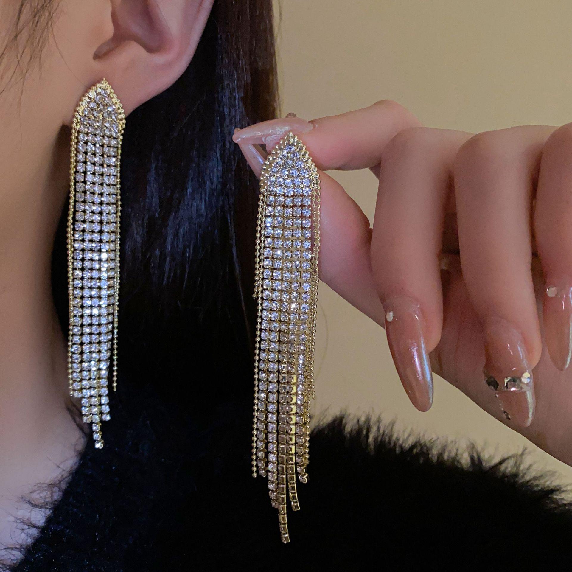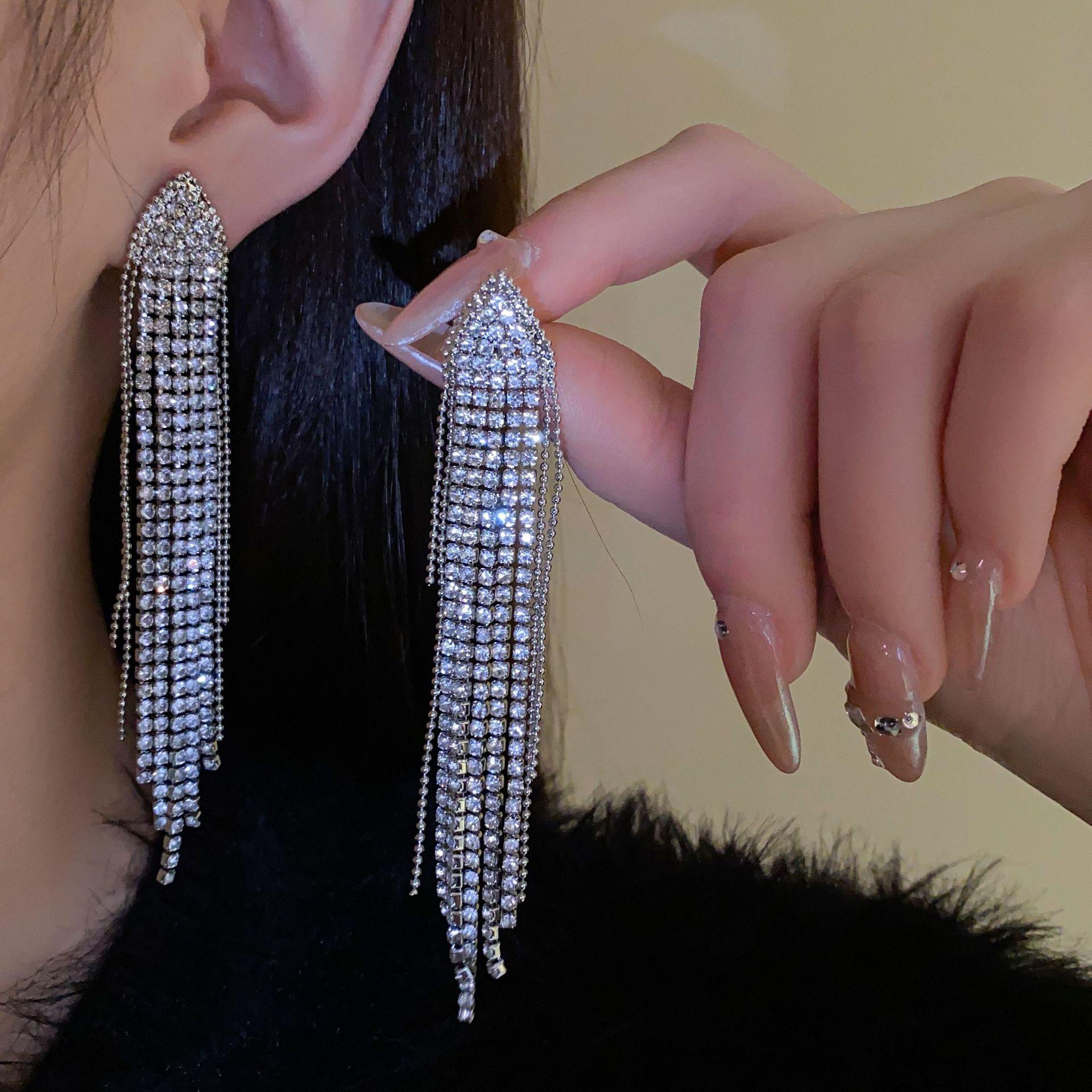 Pendientes largos con borlas geométricas incrustadas con diamantes y aguja de plata, exquisitos pendientes de lujo ligeros, elegantes pendientes de alta calidad, venta al por mayor de fábrica