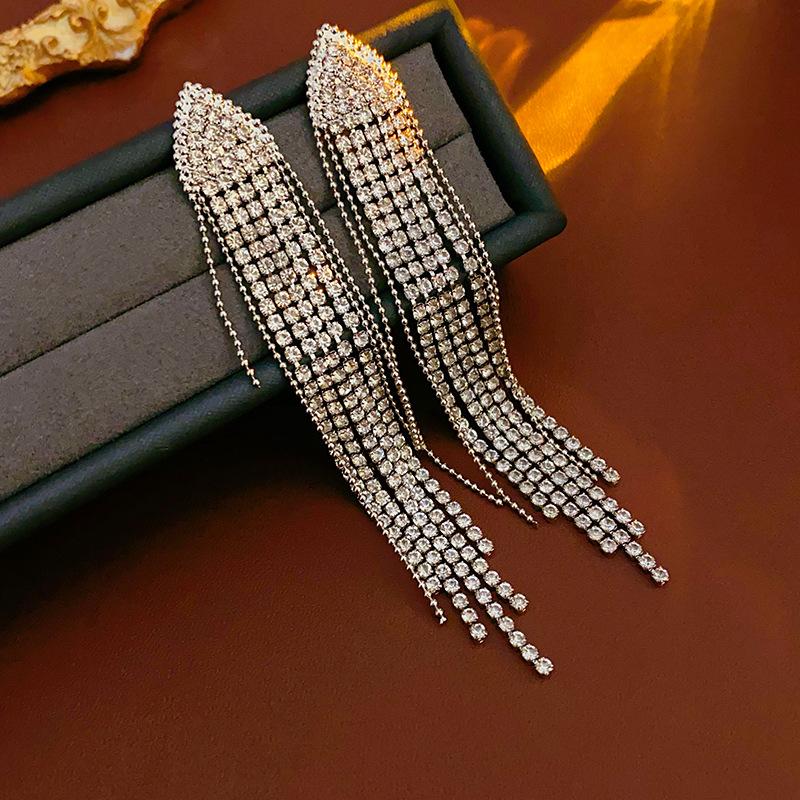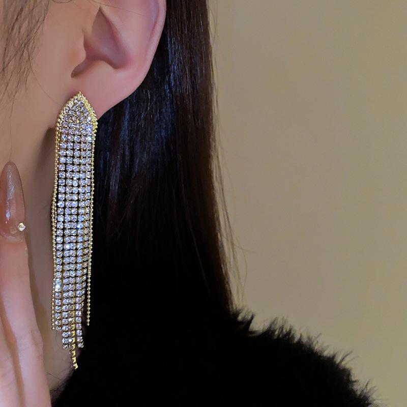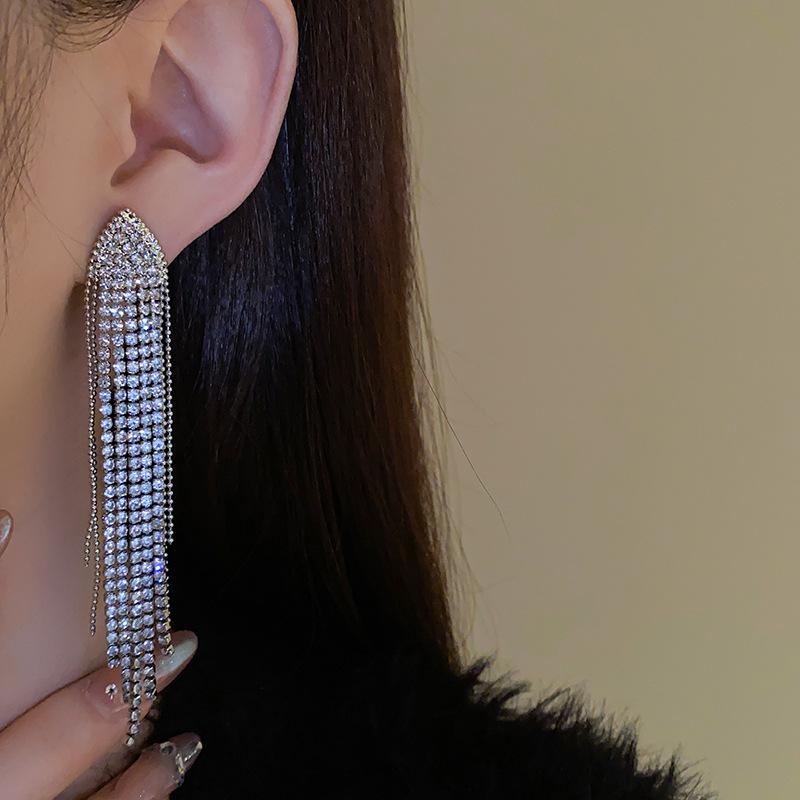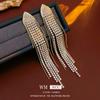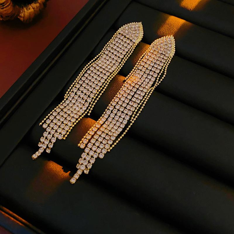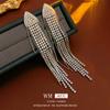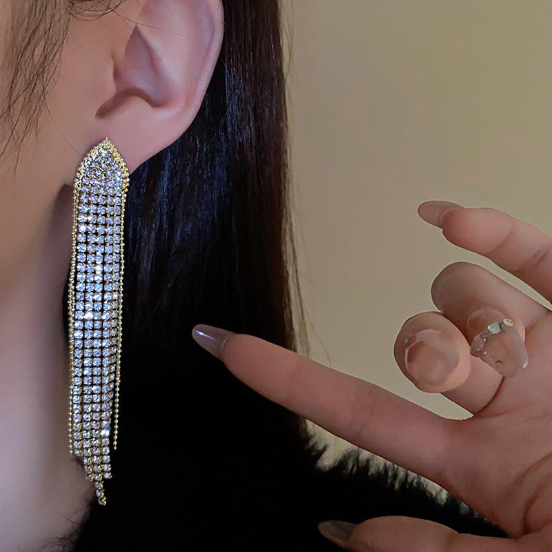 Pendientes largos con borlas geométricas incrustadas con diamantes y aguja de plata, exquisitos pendientes de lujo ligeros, elegantes pendientes de alta calidad, venta al por mayor de fábrica