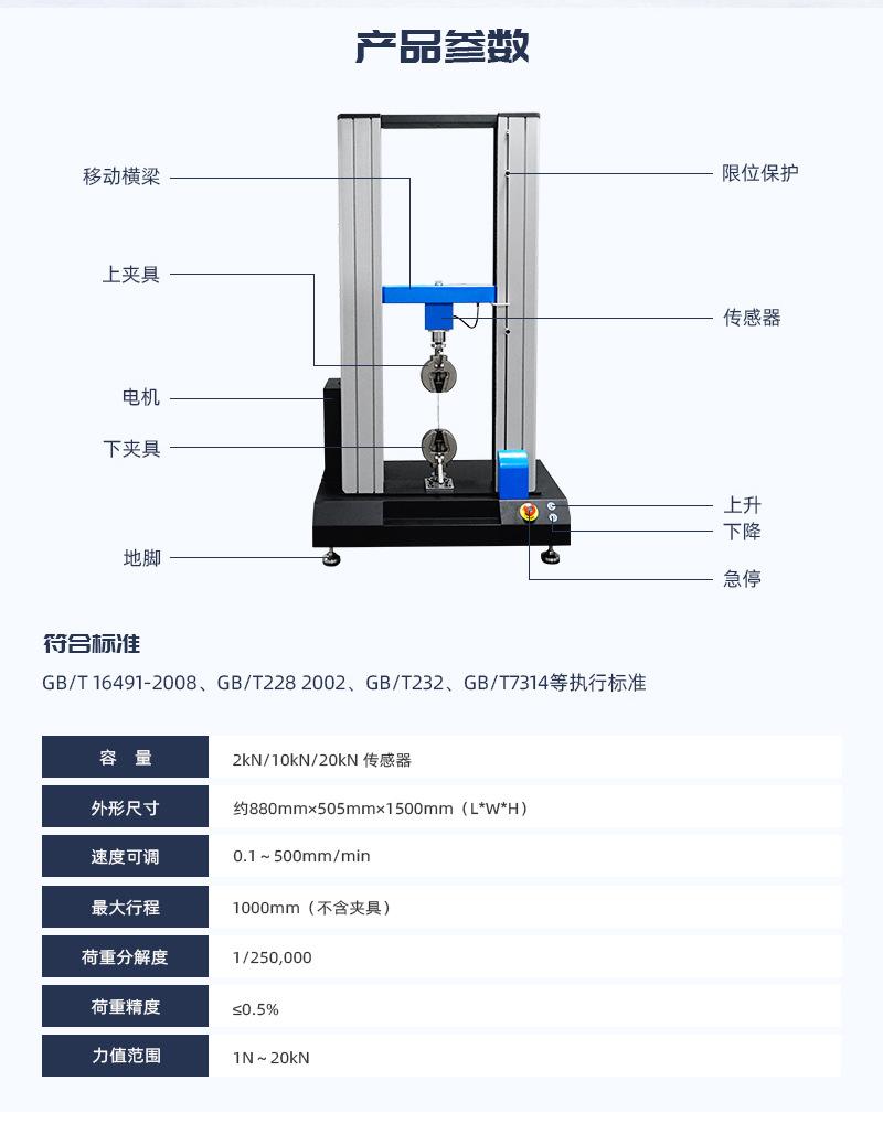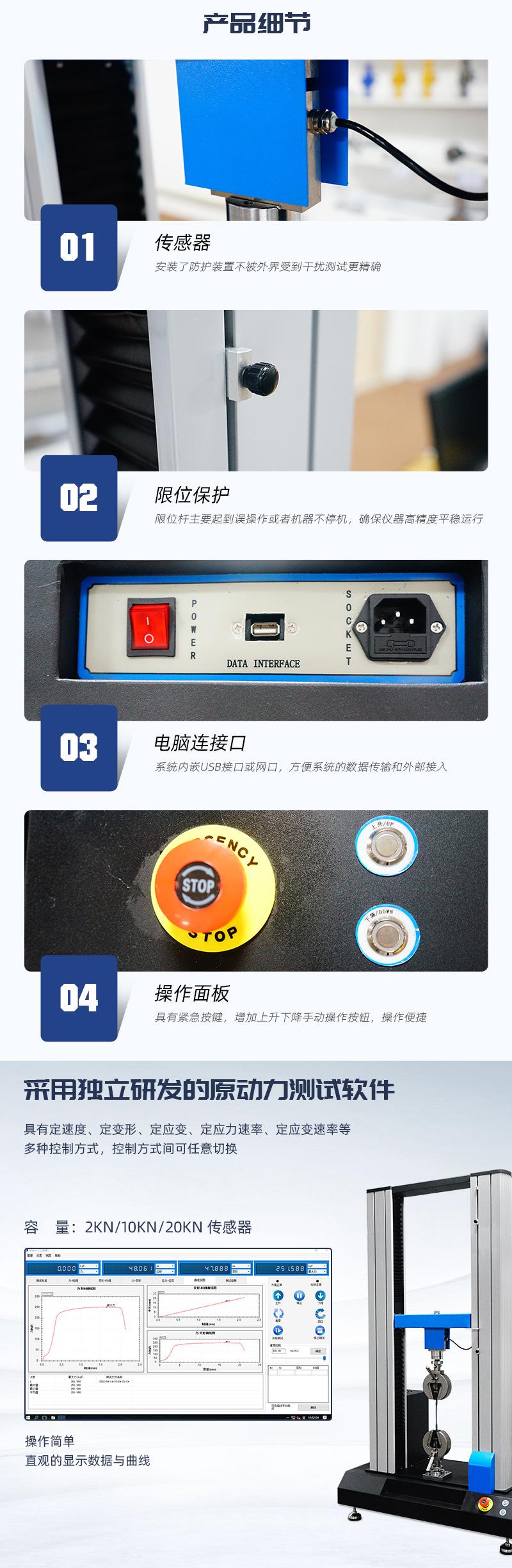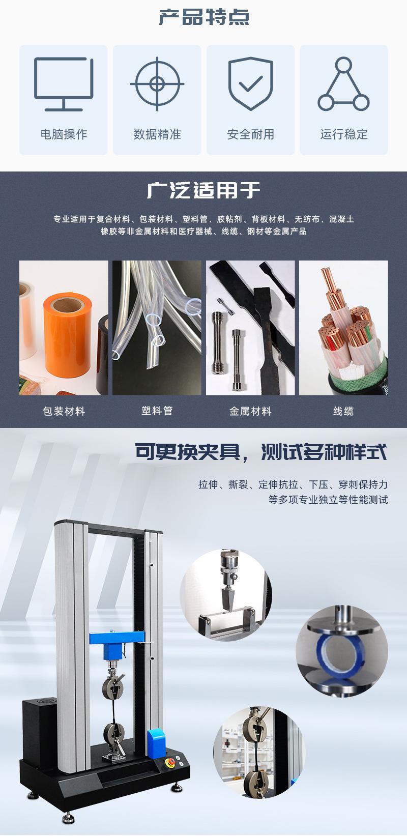 Amplamente utilizado em vários tipos de ferragens, metal, borracha e plásticos, sapatos, couro, roupas, têxteis, isoladores, fios e cabos, terminais e outros materiais para testar sua resistência à tração, rasgo, descascamento, resistência à compressão, flexão e resistência ao cisalhamento, três resistência à flexão de pontos... e outras propriedades de teste de propriedades físicas.