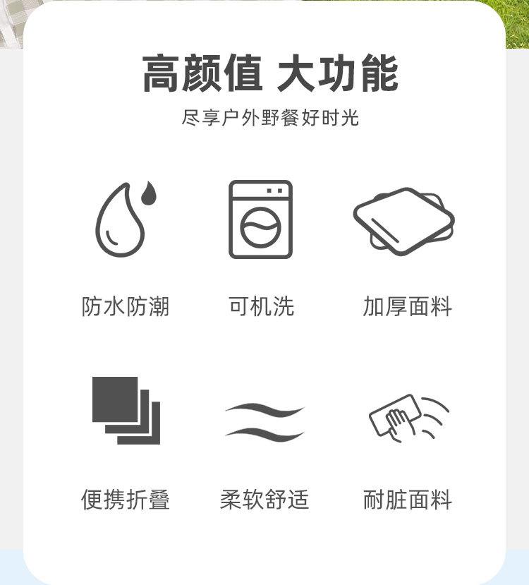 [Características do produto]: Pode ser usado para jantar ao acampar ou sair para um piquenique. Possui superfície de camurça macia e atóxica, peritônio preto na parte inferior e é à prova d'água. Também pode ser usado como tapete rastejante para crianças. É fácil de transportar e possui um pequeno volume de embalagem.