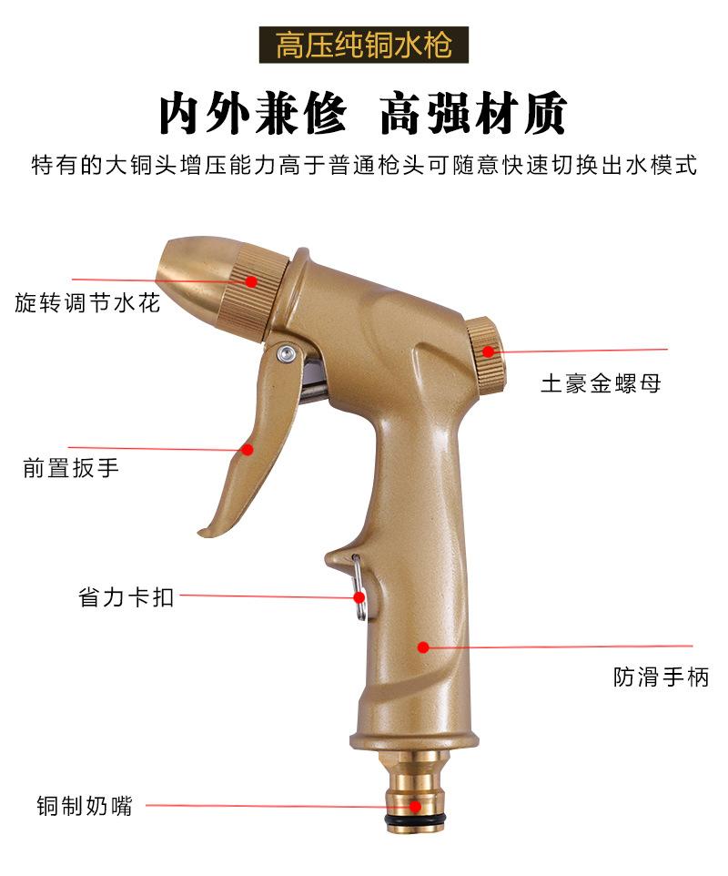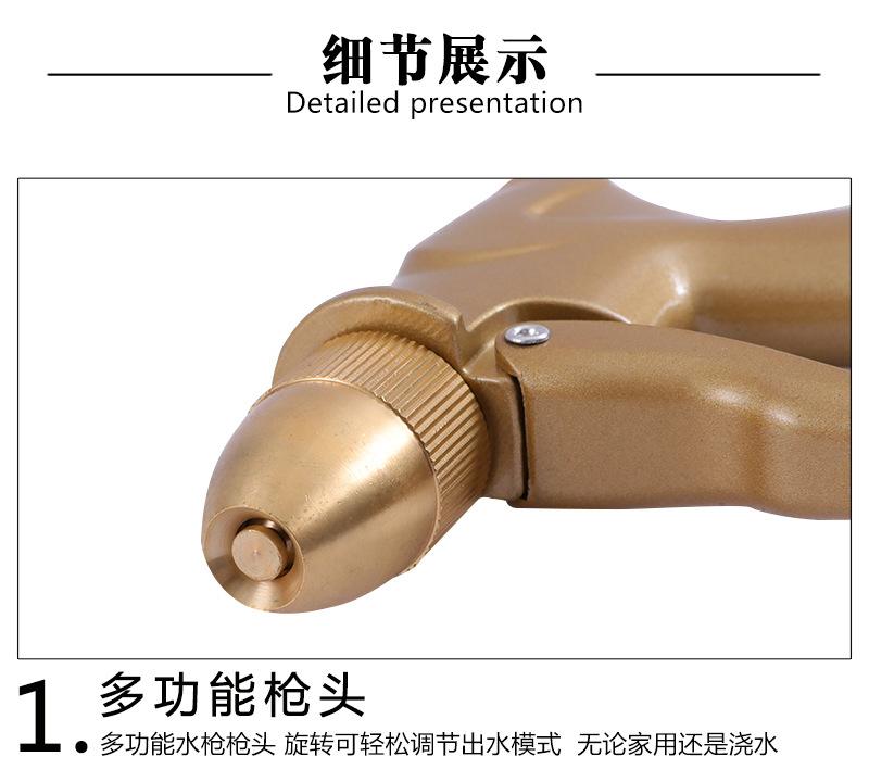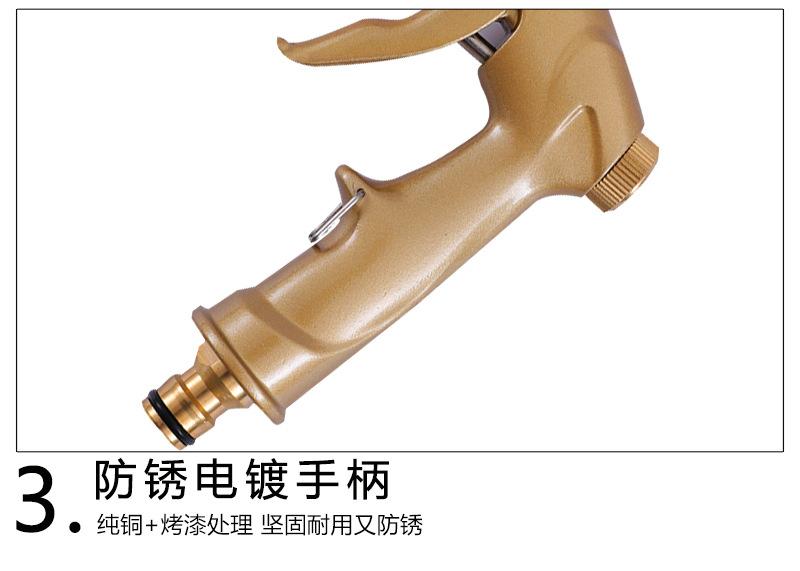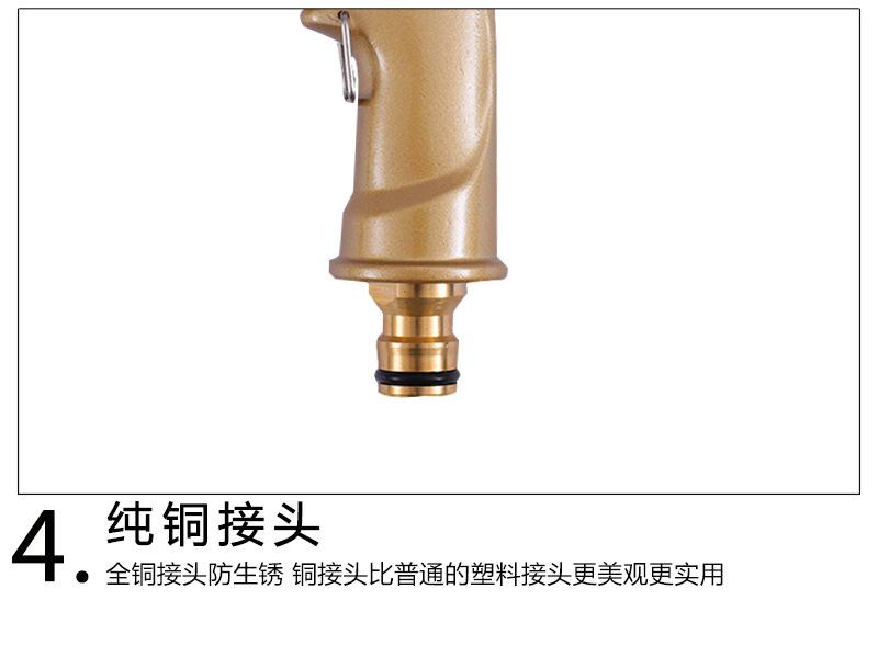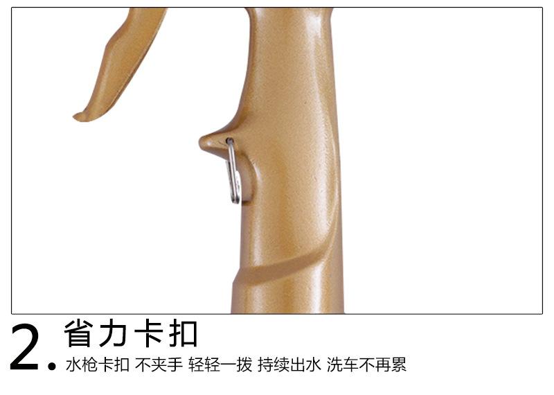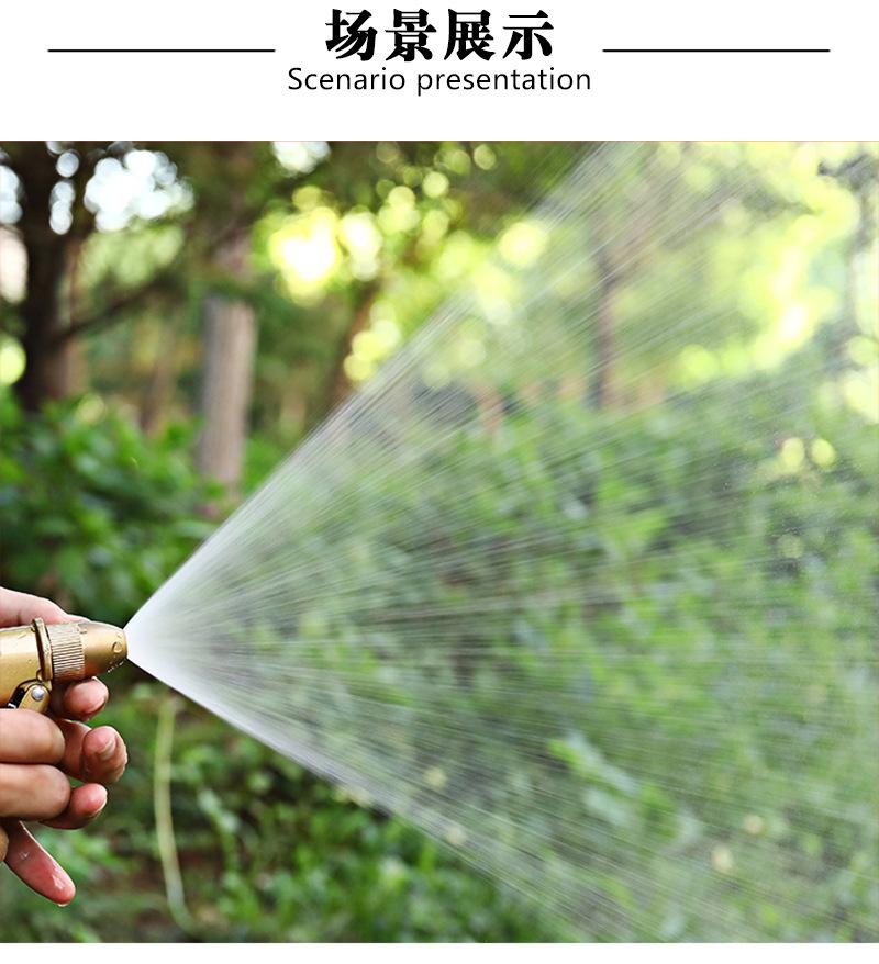 A pistola de pulverização possui um design elástico portátil. Você pode pulverizar água segurando-a com a mão e interromper a pulverização ao soltá-la. Você pode ajustar a cabeça da pistola para pulverizar água em diversas formas, como jatos lineares e precisos, guarda-chuvas d'água em formato de cone e irrigação por aspersão em forma de névoa, para atender a diversas necessidades personalizadas de descarga e irrigação. Além de ser usada para lavagem profissional de carros, também pode ser usada para lavar motocicletas, regar flores e árvores, e limpar banheiros, cozinhas, varandas, corredores, carpetes, etc. É durável e uma boa opção para uso a longo prazo.