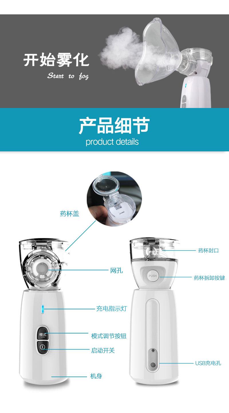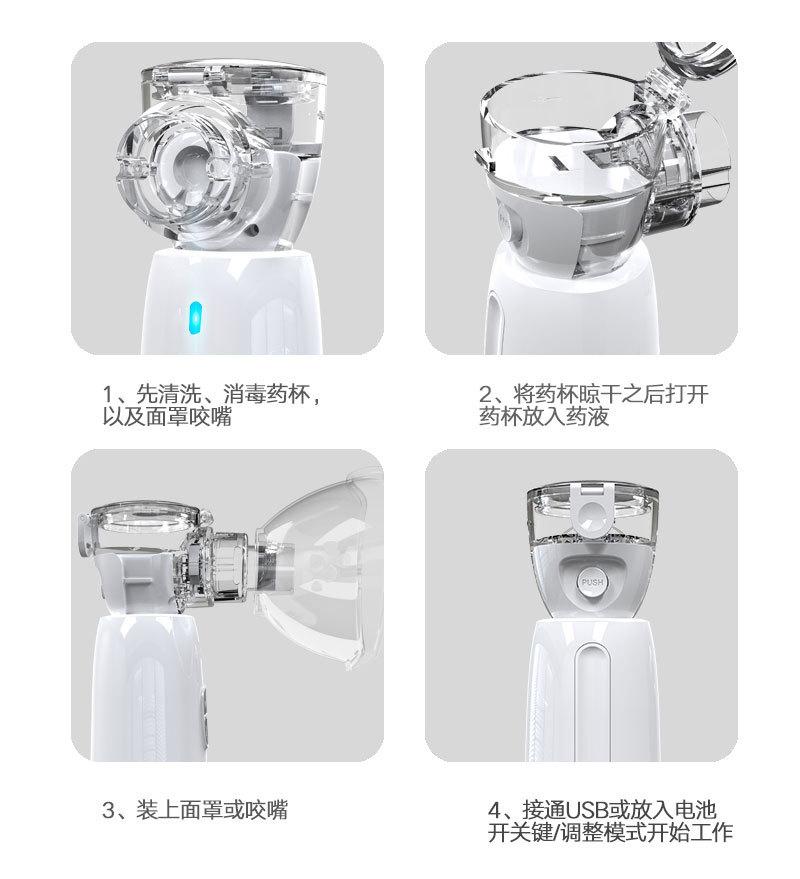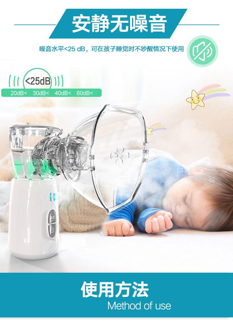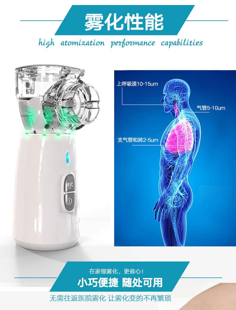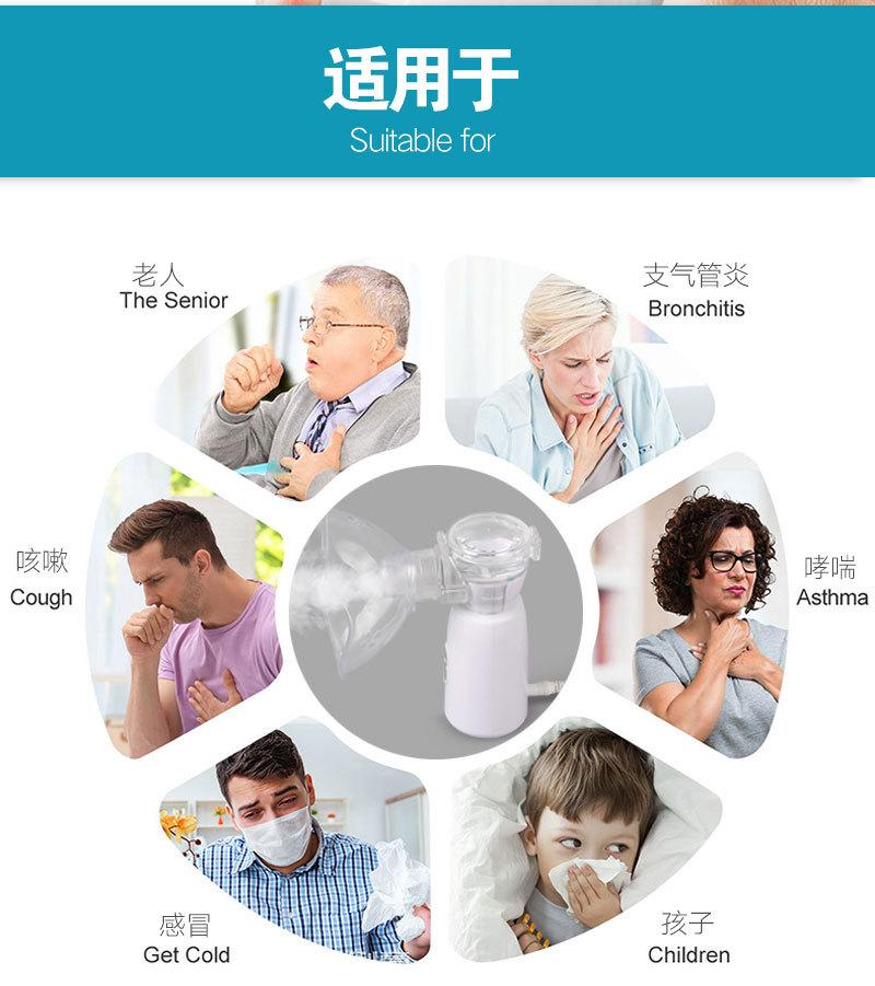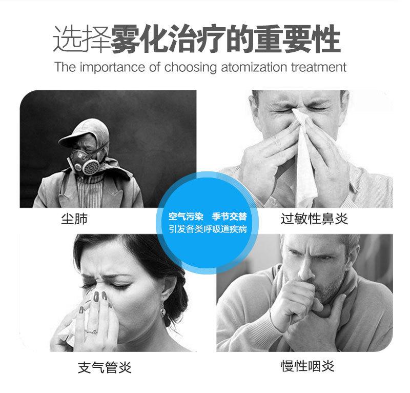 É utilizado principalmente para diversas doenças do aparelho respiratório superior e inferior, como resfriados, febre, tosse, asma, dor de garganta, faringite, rinite, bronquite, pneumoconiose e outras doenças que ocorrem na traquéia, brônquios, alvéolos e cavidade torácica. A inalação por nebulização é um método importante e eficaz no sistema respiratório. Um inalador de atomização é usado para atomizar o líquido medicinal em pequenas partículas. O medicamento entra no trato respiratório e nos pulmões por inalação e é depositado, conseguindo assim um tratamento indolor, rápido e eficaz. Finalidade, administre por aerossol sob orientação médica