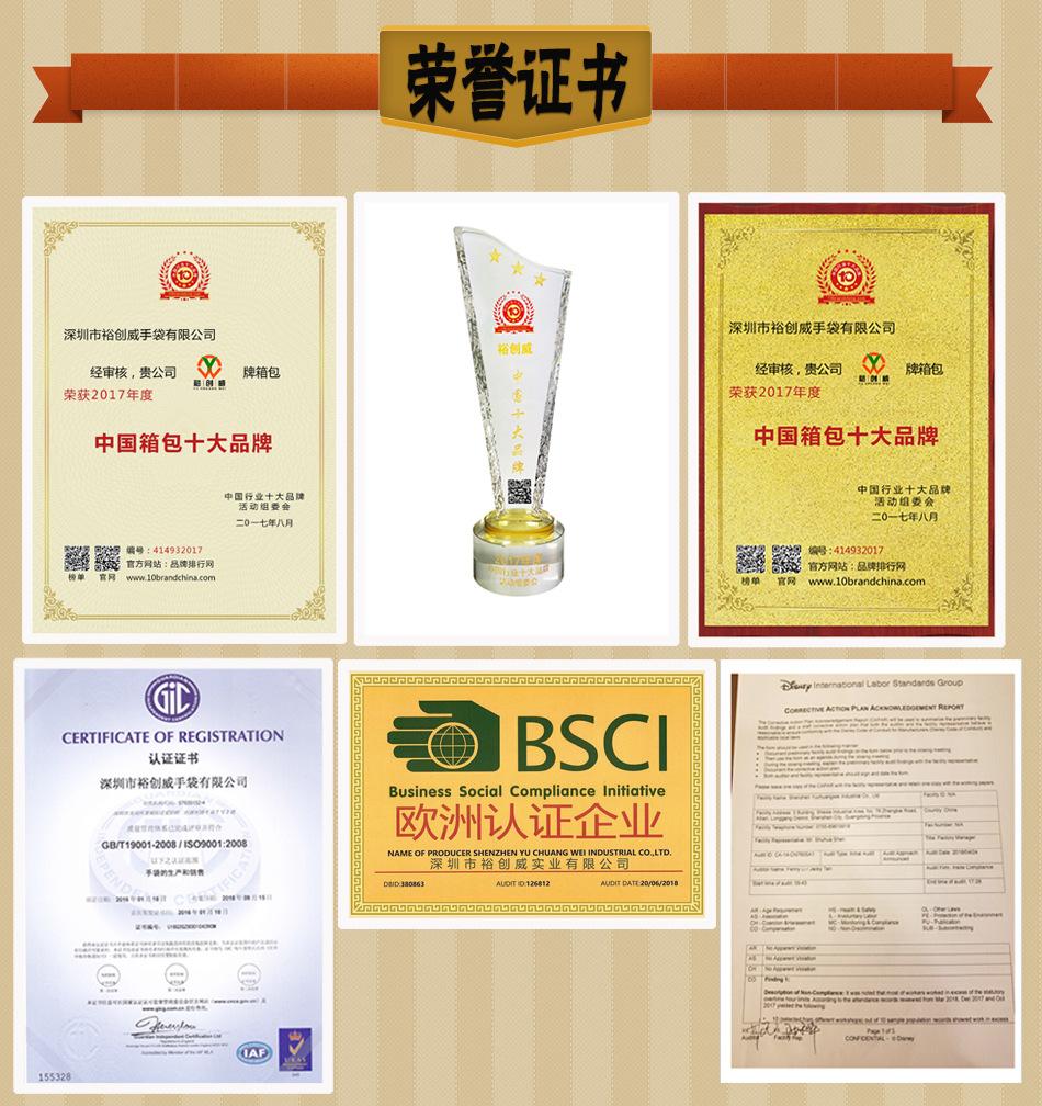 A fábrica de bolsas Shenzhen Yuchuangwei está sediada no Parque Industrial Yuchuangwei, vila de Ailian Zhangbei No. 2, distrito de Longgang, Shenzhen. Foi fundada em 18 de maio de 2006, com área fabril de 7.800,00 metros quadrados.Possui certificado de sistema de gestão de qualidade ISO9001 e inspeção de fábrica Disney e BSCI. Yuchuangwei foi classificada como "Dez principais marcas de bagagem na China" em 2017, 18 de setembro de 2017A filial de Riyu Chuangwei foi inaugurada oficialmente.Nossa empresa é contribuinte geral e pode abrirSelo de IVA de 16%.Possui máquinas de corte, oficinas de produção, departamentos de inspeção de qualidade e departamentos de desenvolvimento, fornecendo serviços completos desde a modelagem até a produção. O equipamento inclui carros planos de computador, carros DY, carros altos, carros de computador e máquinas de pregar, etc. Existem cerca de 200 trabalhadores.
