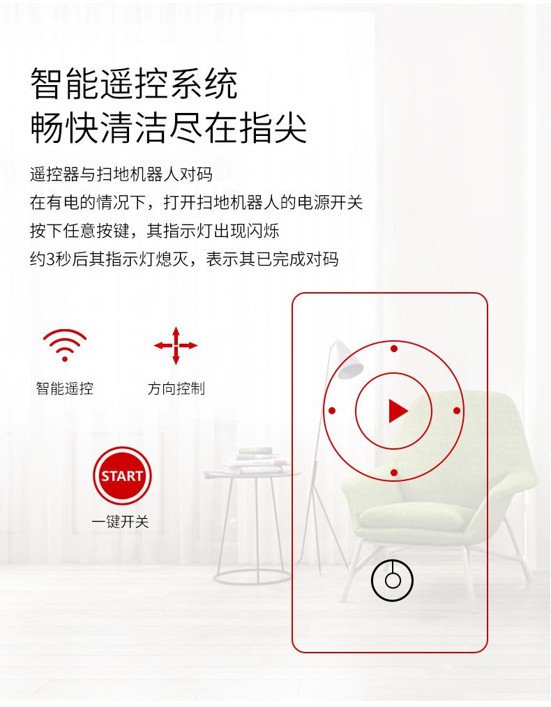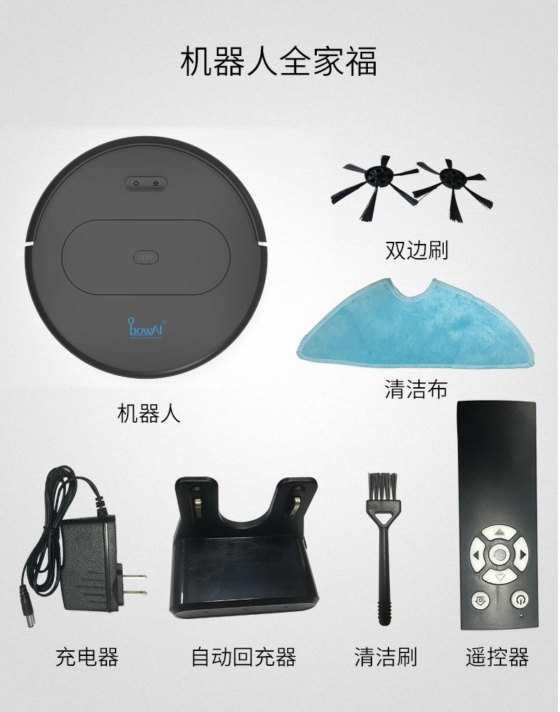 Controle remoto: 1. Frente, trás, esquerda e direita, 2. Recarga de controle remoto, você pode recarregar remotamente a qualquer momento, 3. Função de parada de recarga, continue varrendo o chão, com forte função de sucção