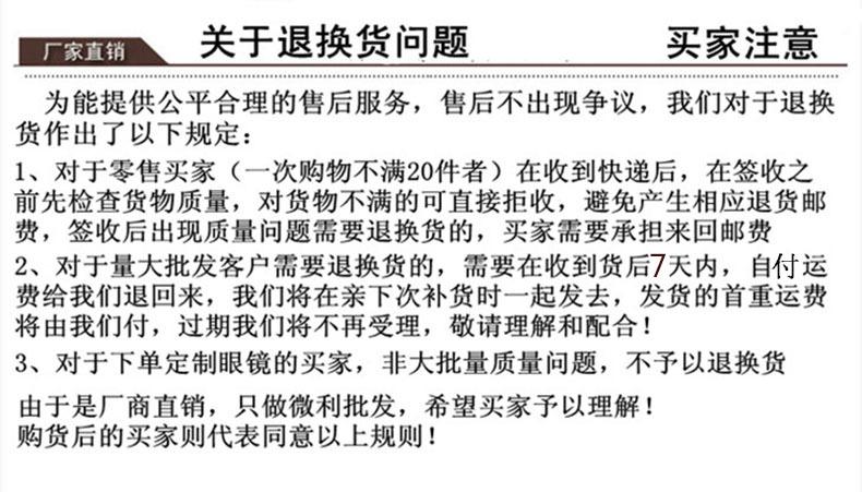 Lembrete caloroso: Em relação à questão do frete de devolução e troca dos clientes, se for enviado em grandes quantidades e houver alguns problemas de qualidade, geralmente é necessário reabastecer o estoque na próxima vez com acessórios ou lentes completas; se for uma pequena quantidade de pedido (geralmente por entrega expressa). Qualquer coisa dentro de um quilograma é chamada de pequena quantidade). Se houver um problema de qualidade e exigir devolução ou troca,
