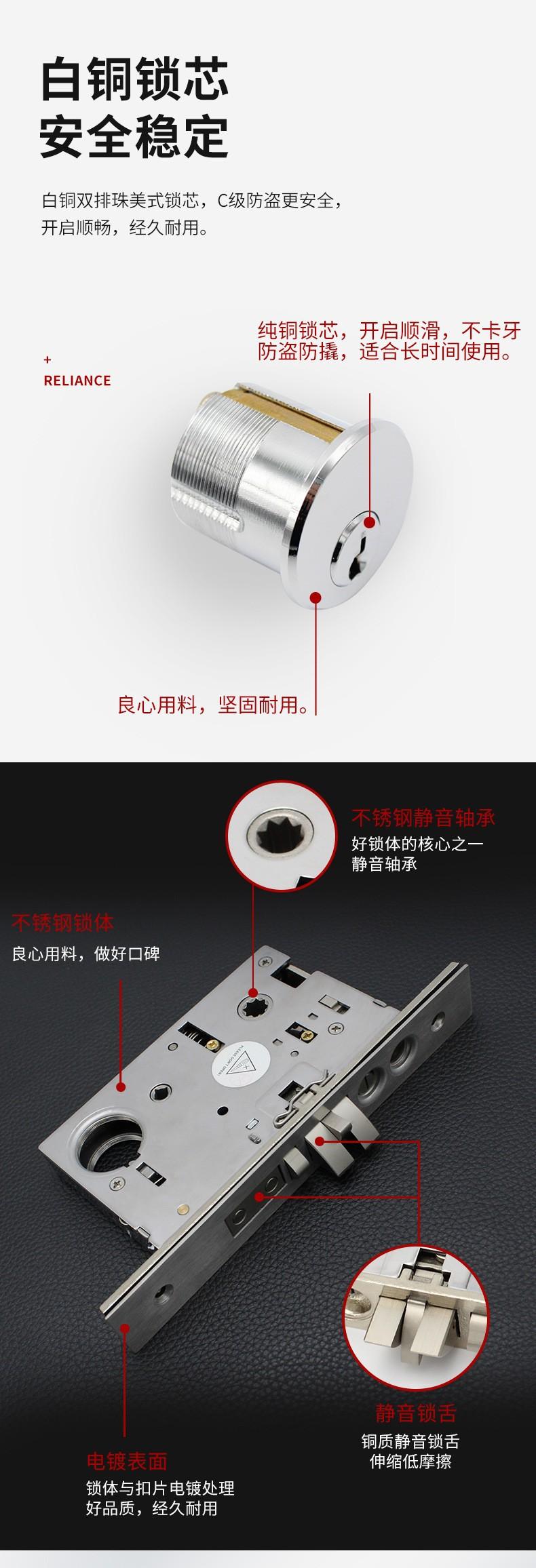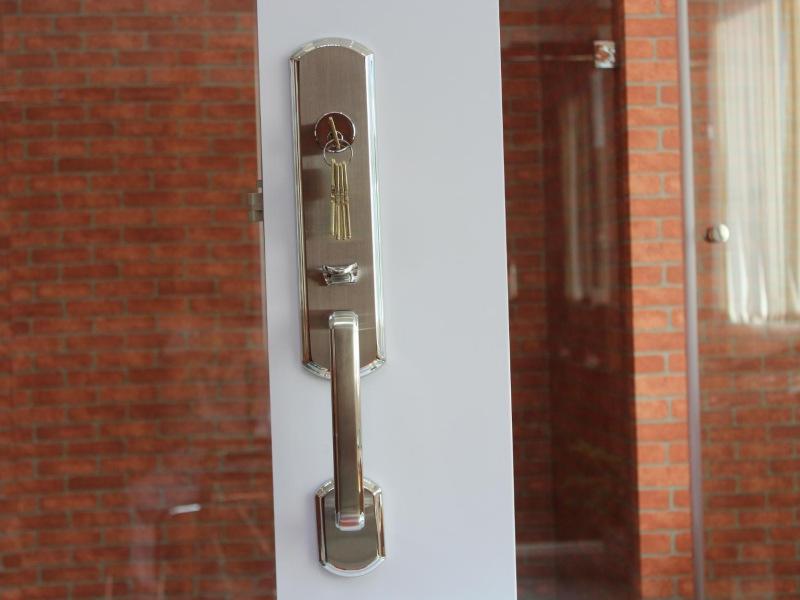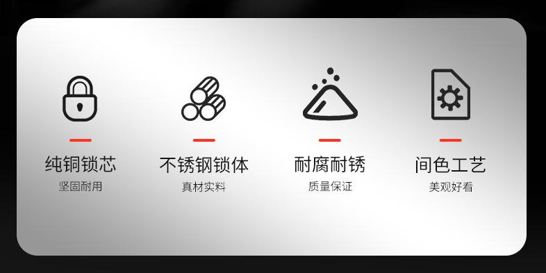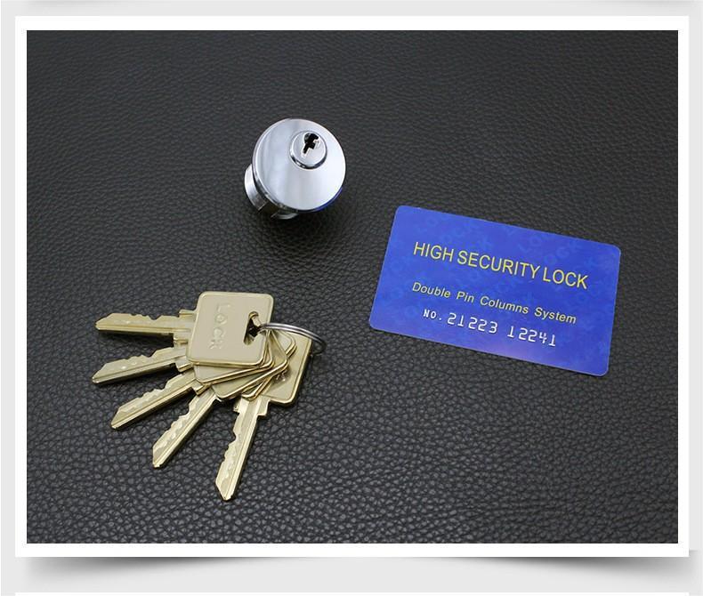8. Material do núcleo da fechadura: cobre branco, tratamento de superfície: cromagem, com 5 chaves de contas de duas fileiras