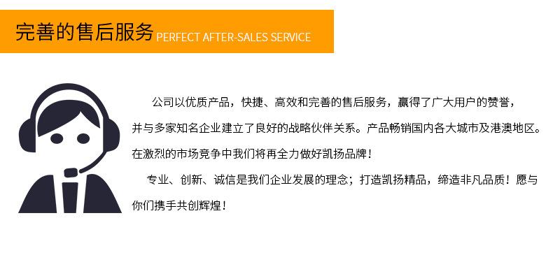 Com excelentes produtos, serviço pós-venda rápido e perfeito, a empresa ganhou elogios dos usuários e estabeleceu boas parcerias estratégicas com muitas empresas conhecidas. Os produtos são vendidos nas principais cidades da China e em Hong Kong e Macau. Na acirrada competição de mercado, faremos o nosso melhor para fazer um bom trabalho na marca Kaiyang!