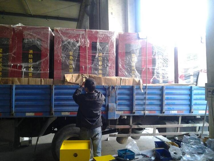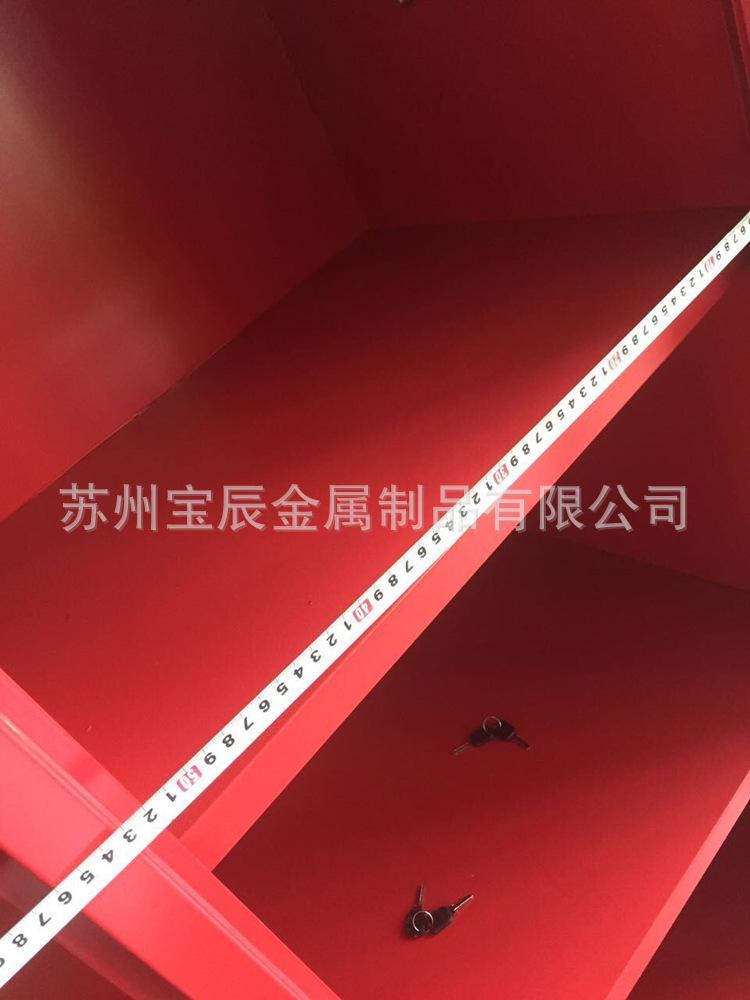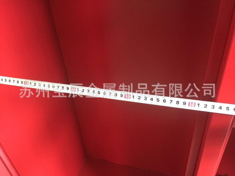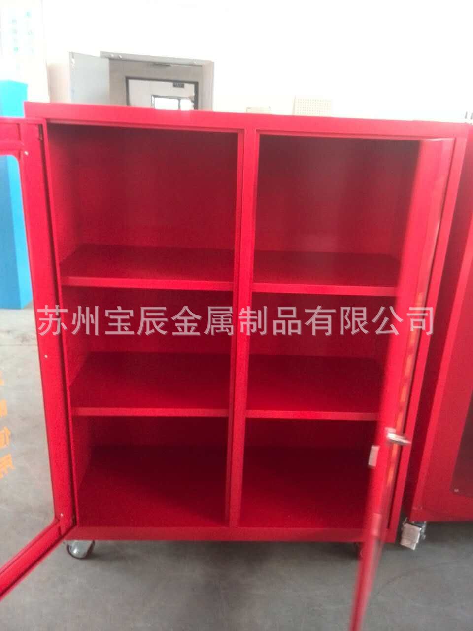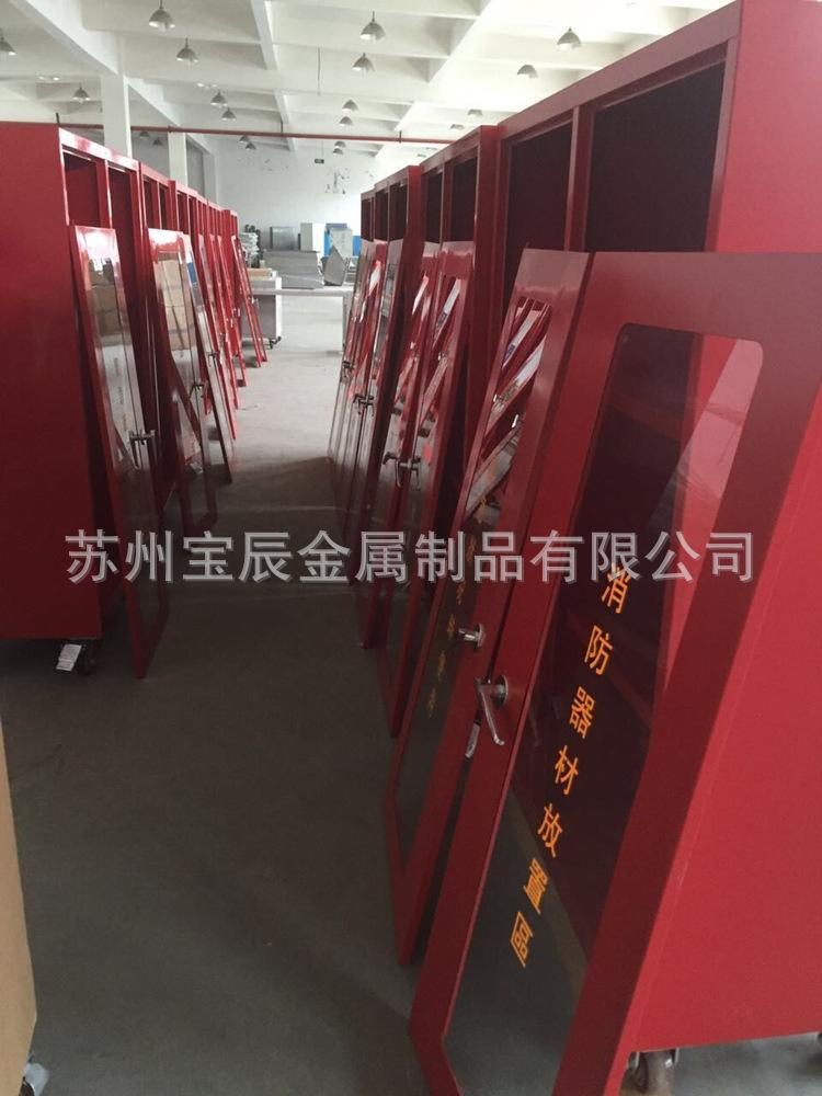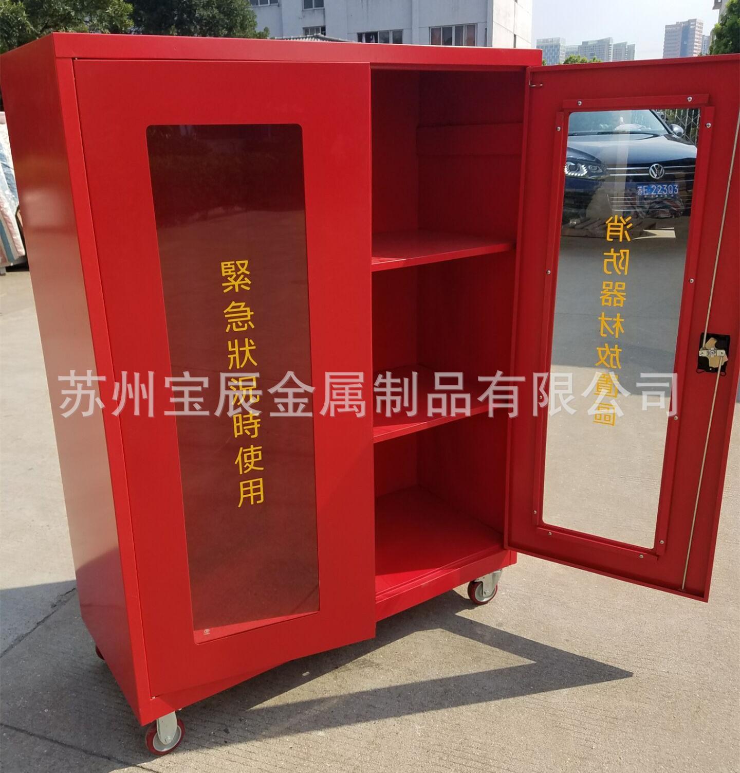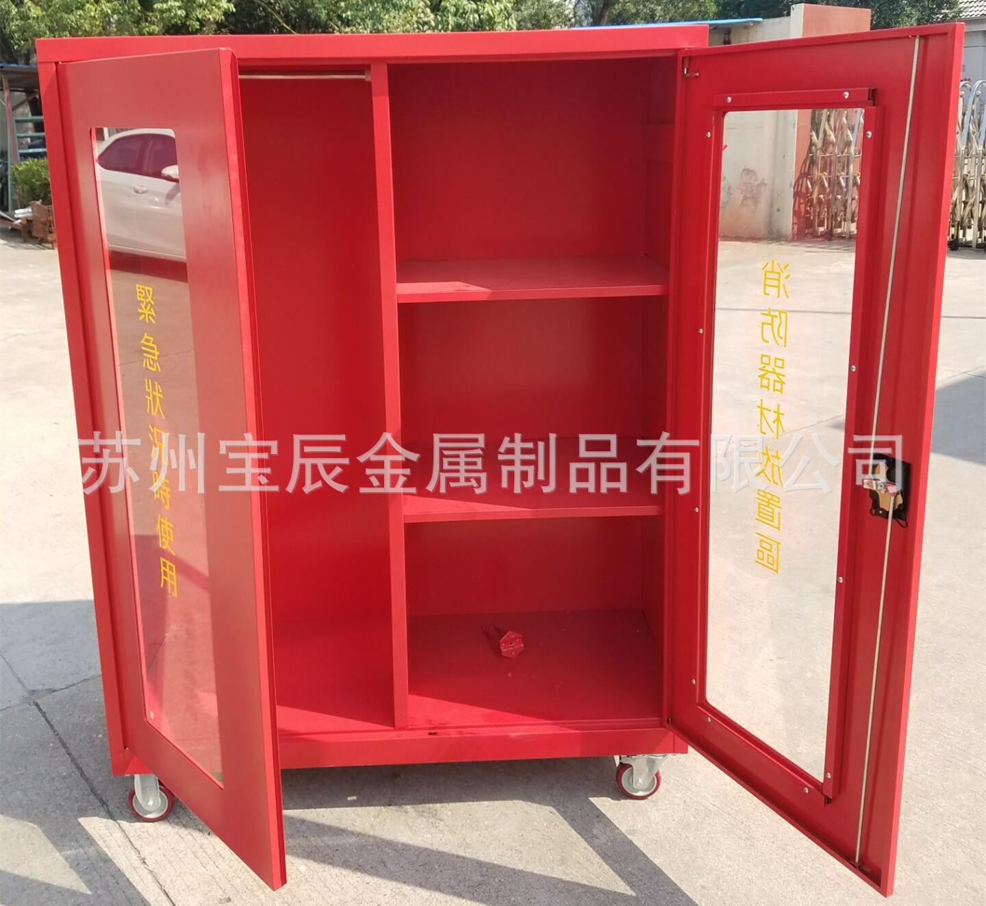 2. Portas duplas, com fechadura, palavras impressas (porta esquerda "proteção contra incêndio", porta direita "119"), prateleira embutida, moldura superior