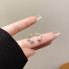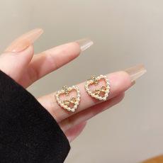 Pendientes de corazón de perla retro francesa, pendientes de lazo con personalidad de moda femenina, pendientes de aguja de plata 925 con pequeña fragancia