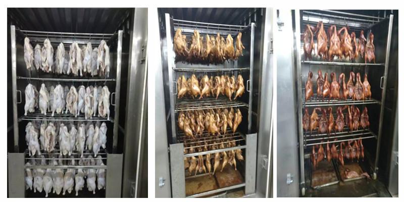 Este equipamento é composto por quatro partes: uma caixa de fumaça, um controlador automático de programa, um gerador de fumaça e um carro de fumaça. O componente principal é um sistema de circulação completo composto por tubos de vapor, trocadores de calor e canais de saída de ar. A mistura de gases de fumaça e ar quente na caixa forma uma área de vórtice sob a ação de dois conjuntos de ventiladores circulantes, de modo que a mistura de gases passe pelos produtos cárneos suspensos na caixa de fumaça de forma equilibrada e uniforme a uma velocidade adequada , para que os produtos cárneos sejam maturados e esterilizados.