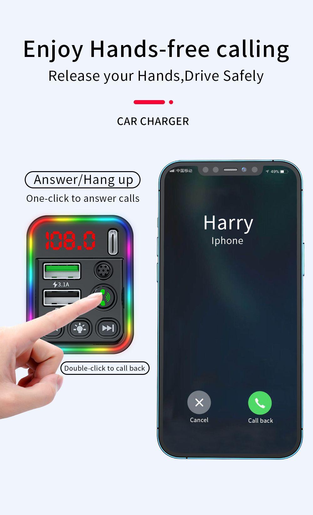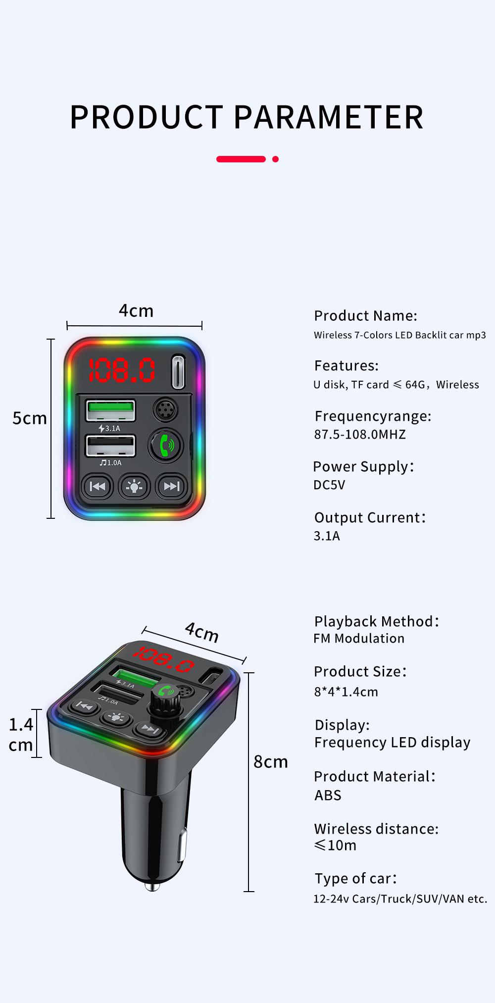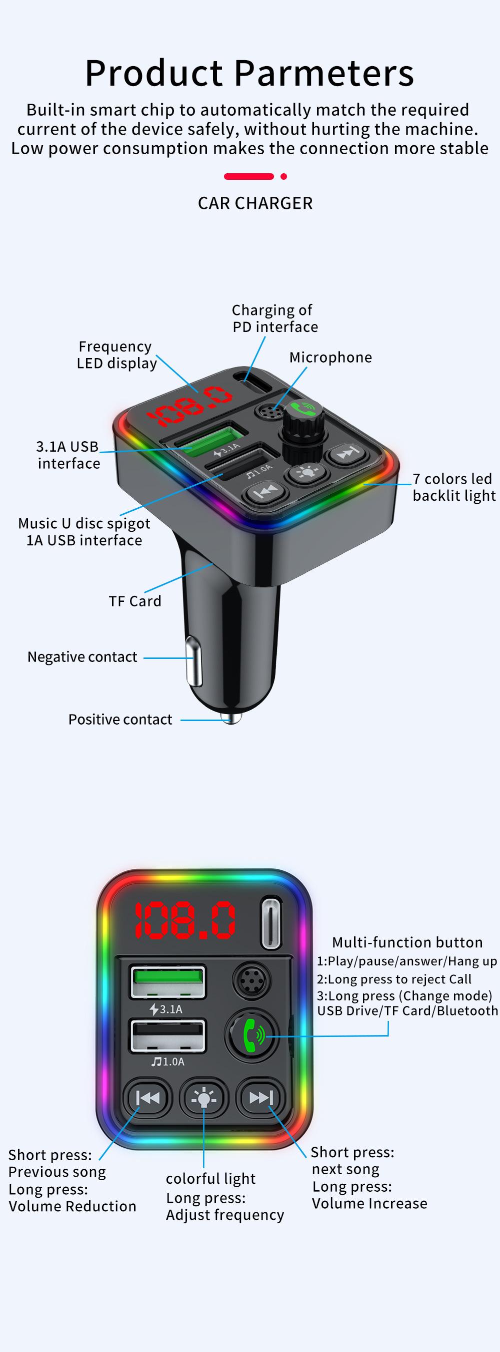 7: Fonte de alimentação do isqueiro: fonte de alimentação de tensão DC12V-24V; 8: Bluetooth versão 5.0 Frequência de transmissão FM: 87,5 ~ 108 MHz 9. Detecção de tensão