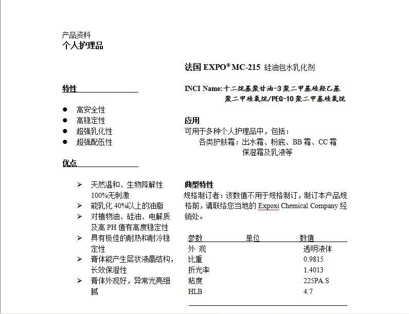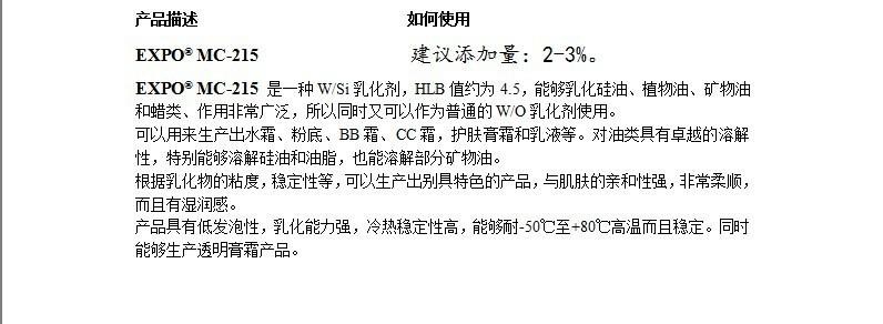 O emulsificante MC215 é um emulsificante de silicone óleo em água exclusivo atualmente disponível. Pode ser utilizado para produzir produtos com a mesma qualidade e efeito de marcas de renome internacional, como Olay Y e Zisheng T (creme, loção), que apresentam aparência brilhante e efeito hidratante suave e agradável à pele.
