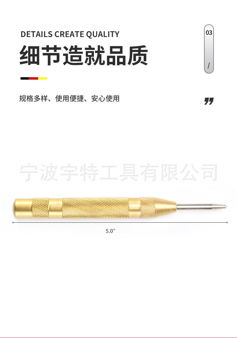 Modo de uso: Alinhe o ponto de posicionamento com a cabeça pesada, segure o cabo com força e pressione com força na direção do punção. Depois que o punção é pressionado de volta na haste por uma curta distância, a mola forte irá estourar o punção com força, criando um amassado para a ponta. Nenhuma cooperação é necessária. Martelos e outras ferramentas são simples e fáceis de usar.