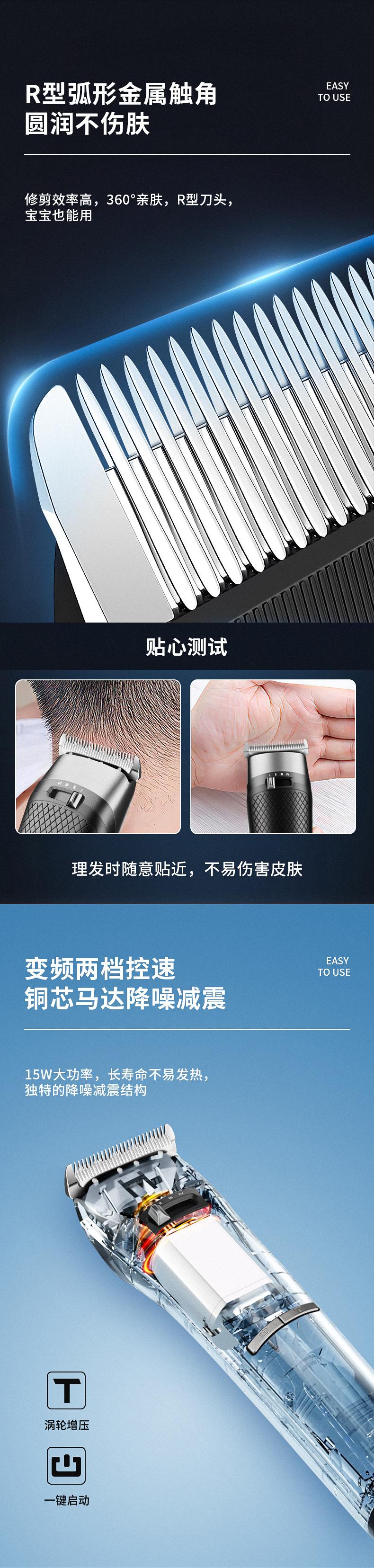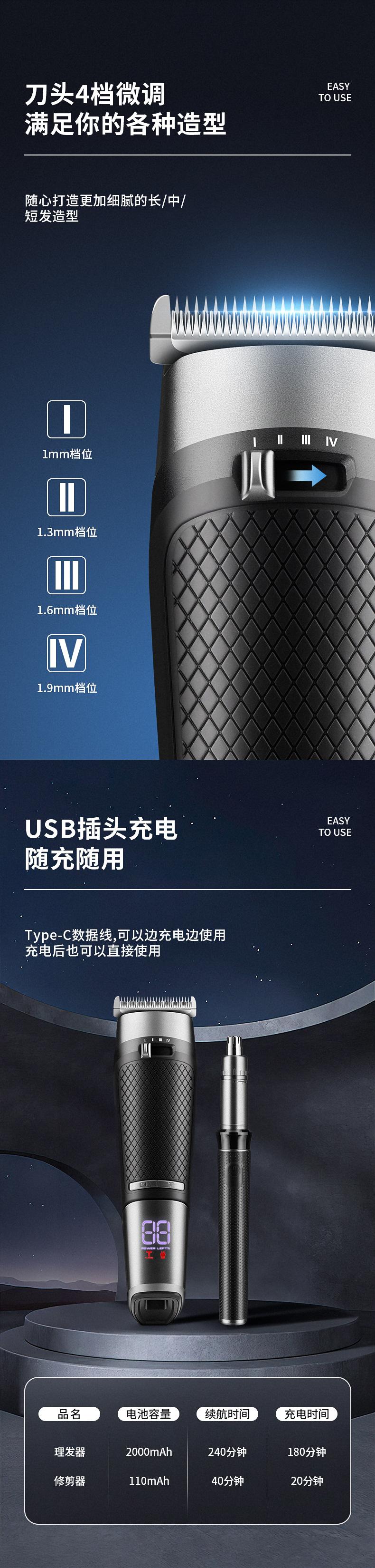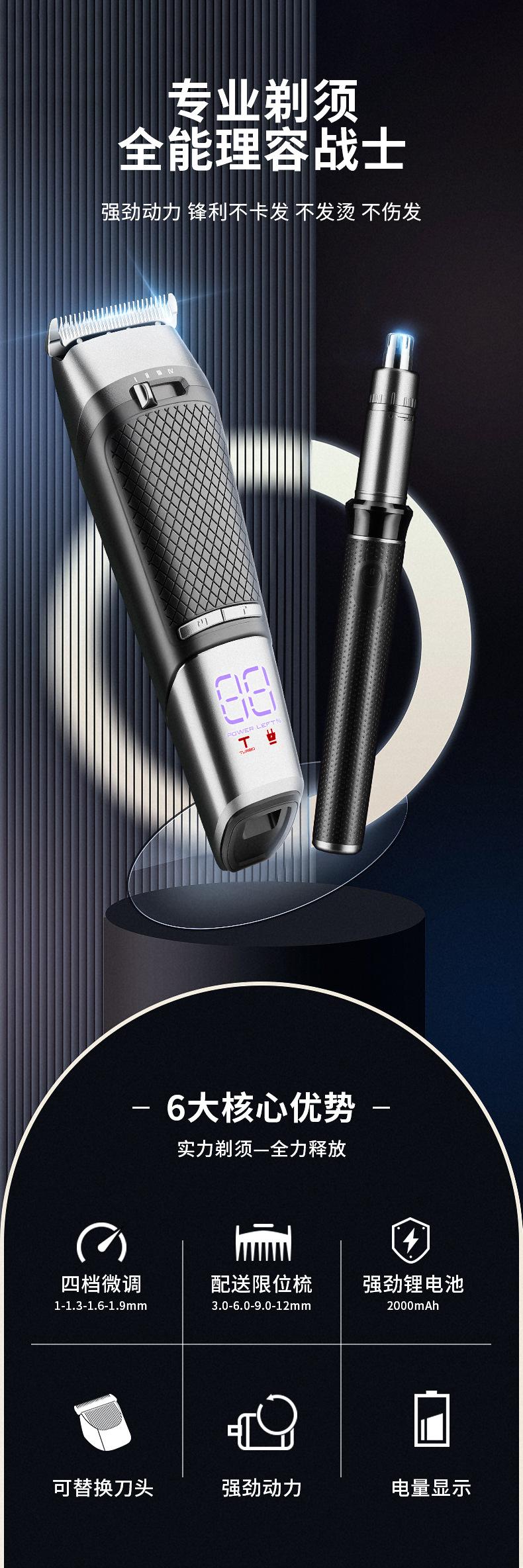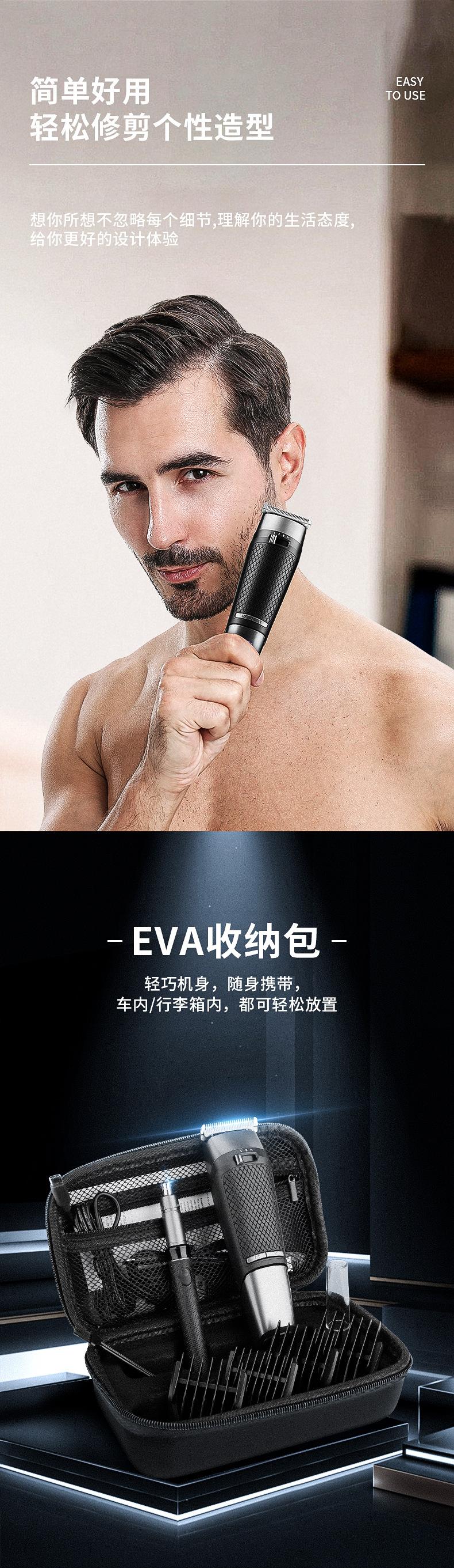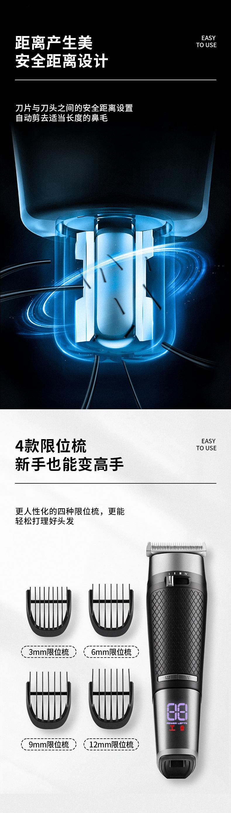 Acessórios incluídos: máquina de cortar cabelo + removedor de pêlos do nariz + bolsa de armazenamento + pente limite * 4 + cabo de carregamento TYPE-C * 2 + escova de limpeza + pente.
