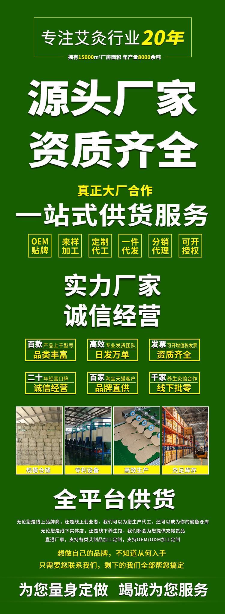 Nanyang Ai Tu é um fabricante profissional de produtos moxa que integra pesquisa e desenvolvimento, produção, processamento, OEM, ODM, atacado e vendas de produtos moxa. A empresa possui qualificações formais, como licença formal de produção, número de aprovação, registro do produto, relatório de inspeção de qualidade, etc. Contando com as condições geográficas e ecológicas únicas de Nanyang, a empresa continuou a fornecer fornecimento estável para várias empresas de vendas, salas de moxabustão, medicina chinesa salões, salões de beleza e várias lojas online Taobao, lojas Tmall e outros parceiros de plataforma em todo o país por muitos anos. A empresa possui qualificações completas, forte resistência e qualidade de produto estável. Todos os principais agentes são bem-vindos para visitar a fábrica.