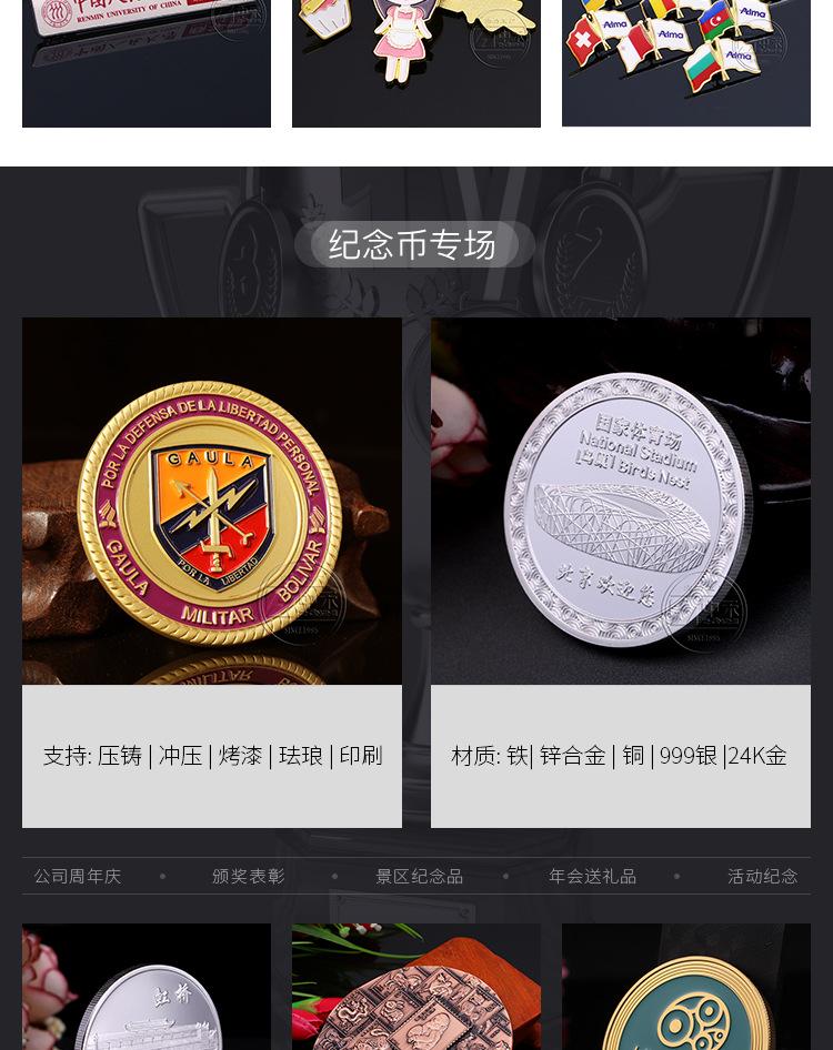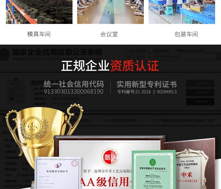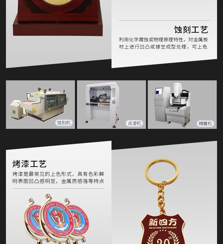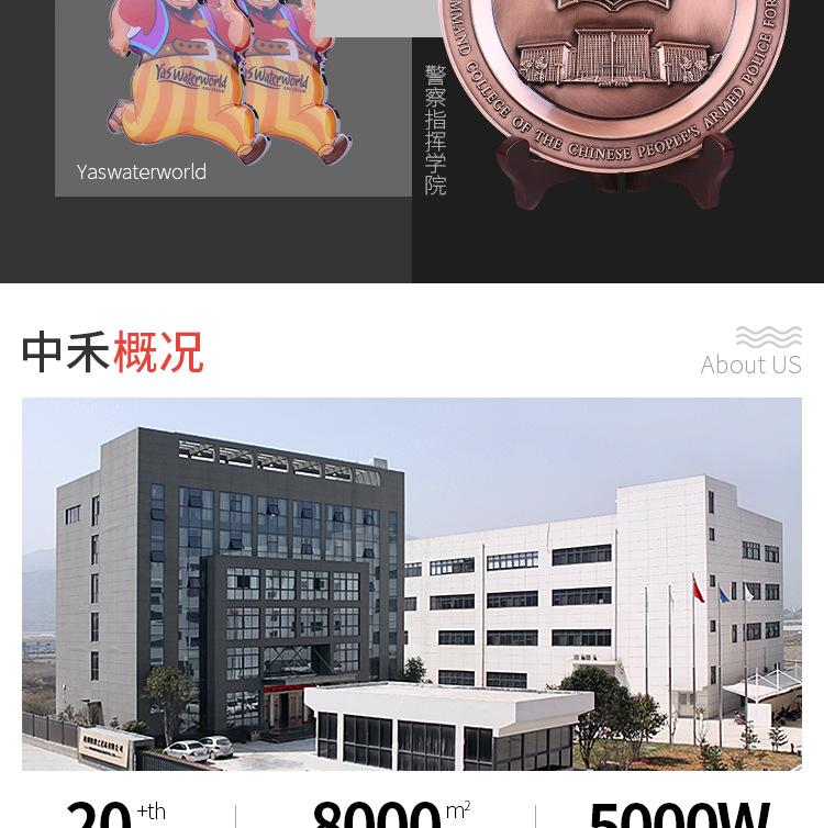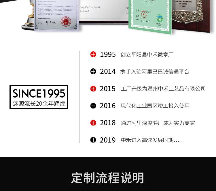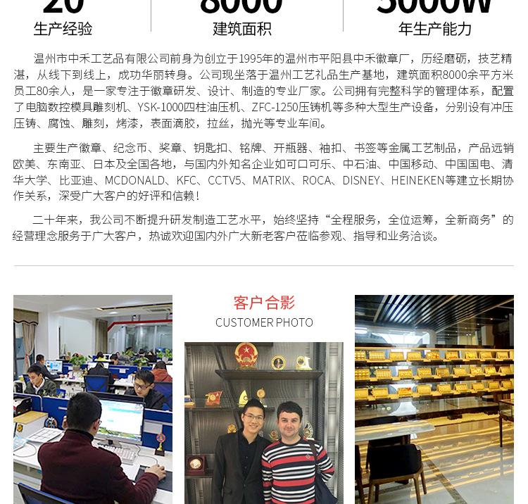 Wenzhou Zhonghe Arts & Crafts Co., Ltd. era anteriormente a Wenzhou Pingyang County Zhonghe Badge Factory fundada em 1995. Após anos de trabalho árduo e habilidades requintadas, ela se transformou com sucesso de offline para online. A empresa está agora localizada na Base de Produção de Presentes Artesanais de Wenzhou, com uma área de construção de mais de 8.000 metros quadrados e mais de 80 funcionários. É um fabricante profissional com foco em pesquisa e desenvolvimento, design e fabricação de crachás. A empresa possui um sistema de gestão completo e científico, equipado com uma variedade de equipamentos de produção em grande escala, como máquinas de gravação de moldes CNC, prensas hidráulicas de quatro colunas YSK-1000 e máquinas de fundição sob pressão ZFC-1250. Existem oficinas profissionais para estamparia, fundição sob pressão, corrosão, gravura, pintura para cozimento, gotejamento de cola superficial, trefilagem, polimento, etc. Produz principalmente emblemas, moedas comemorativas, medalhas, chaveiros, placas de identificação, abridores de garrafas, abotoaduras, marcadores e outros produtos artesanais de metal. Os produtos são exportados para Europa, América, Sudeste Asiático, Japão e todo o país. Estabeleceu relações de cooperação de longo prazo com empresas nacionais e estrangeiras conhecidas e é profundamente elogiada e confiável pelos clientes!