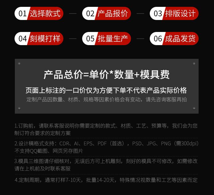 1. Projeto de produto e confirmação de desenho: Ao personalizar produtos, os clientes precisam fornecer desenhos de projeto, quantidade, especificações, tecnologia de tratamento de superfície, embalagem e outros requisitos específicos. Recomenda-se que os clientes forneçam AI/CDR/PDF e outros arquivos de origem de design. Se não houver design original, também poderão ser fornecidas imagens mais nítidas;