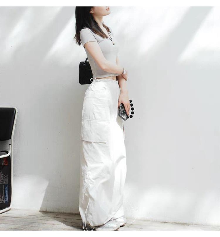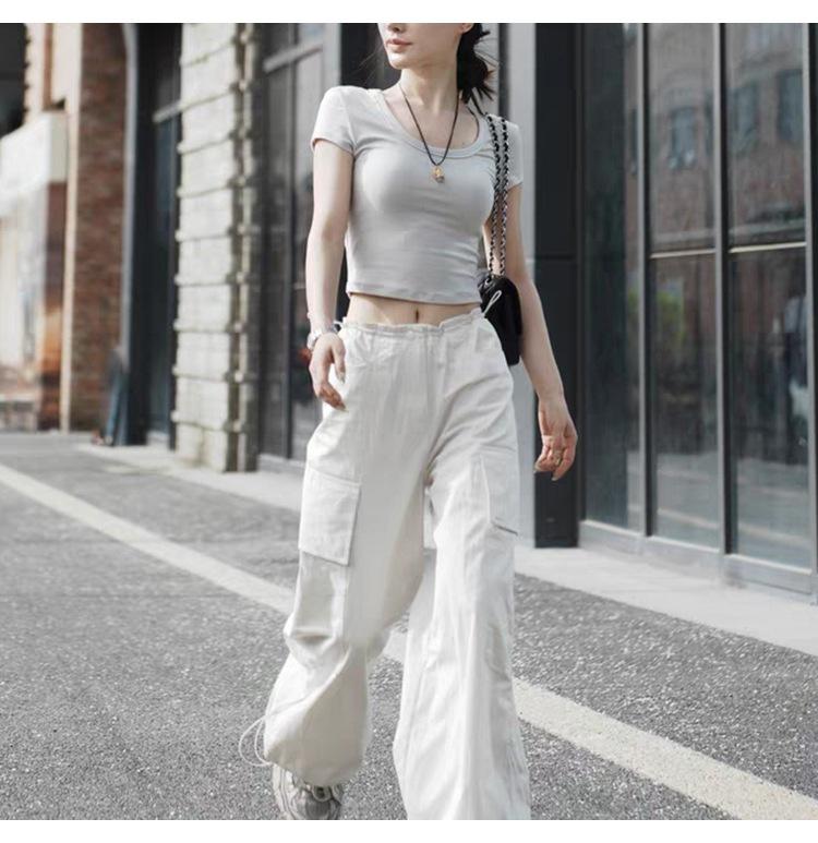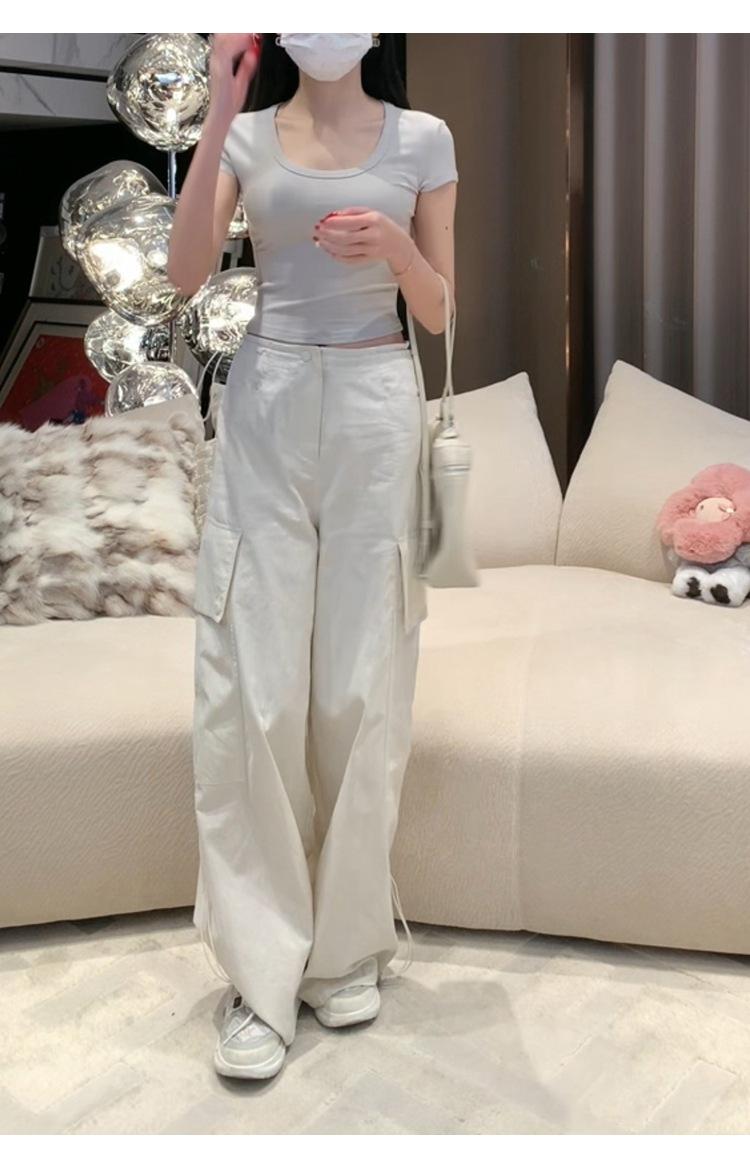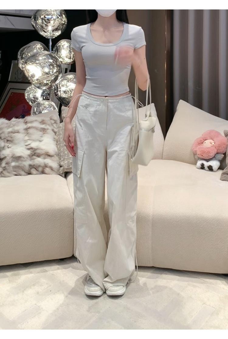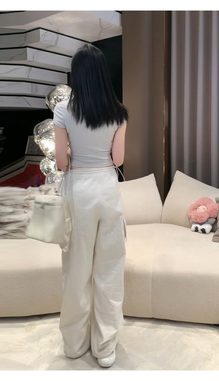 Há bolsos laterais quadrados em ambos os lados da cintura frontal e grandes bolsos quadrados nas laterais das calças.