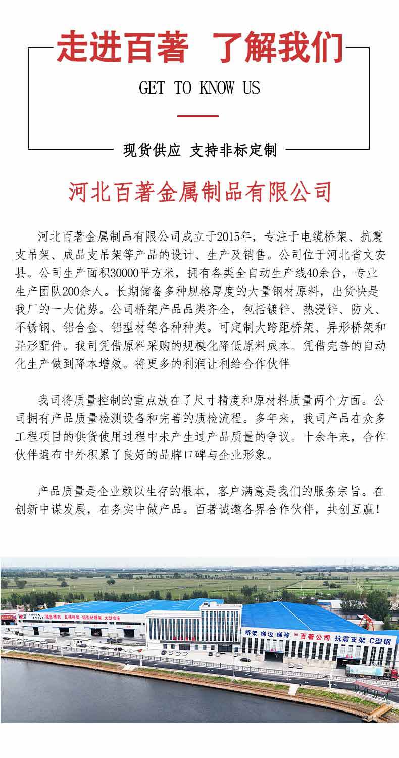 Hebei Baizhu Metal Products Co., Ltd. se dedica principalmente a: charola para cables ignífuga, charola para cables galvanizada, charola para cables a prueba de fuego, charola para cables galvanizada en caliente, zinc-aluminio-magnesio, charola para cables tipo canal, charola para cables tipo escalera, charola para cables de aleación de aluminio, charola para cables de acero inoxidable y varias charolas para cables de formas especiales (borde de gota de agua, borde redondeado, borde de autobloqueo)