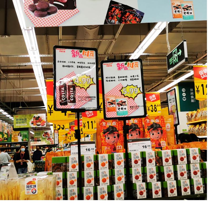 Prateleira de supermercado local, loja de departamentos, etiqueta de preço de mercadoria, etiqueta de gancho de plástico transparente, etiqueta de preço de PVC
