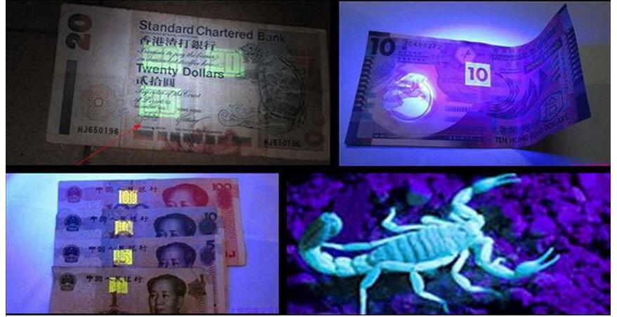 (LEDs azuis baratos são frequentemente usados no mercado agora e não podem produzir o mesmo efeito que a luz roxa.)