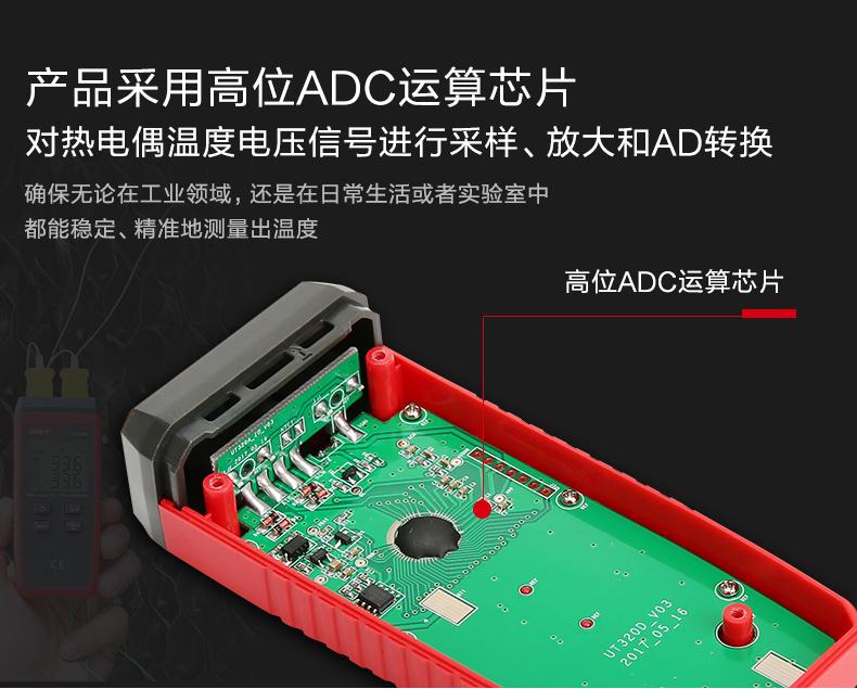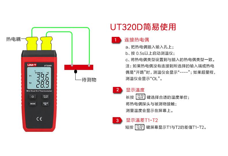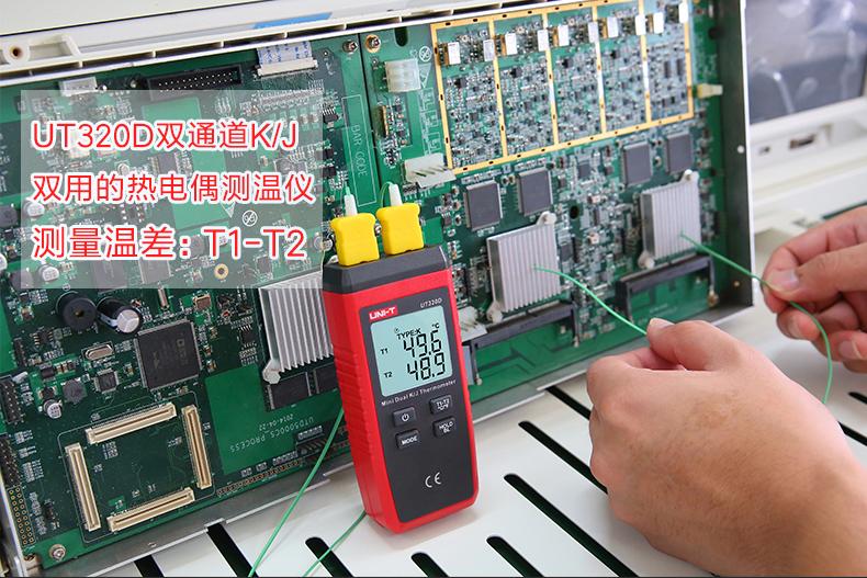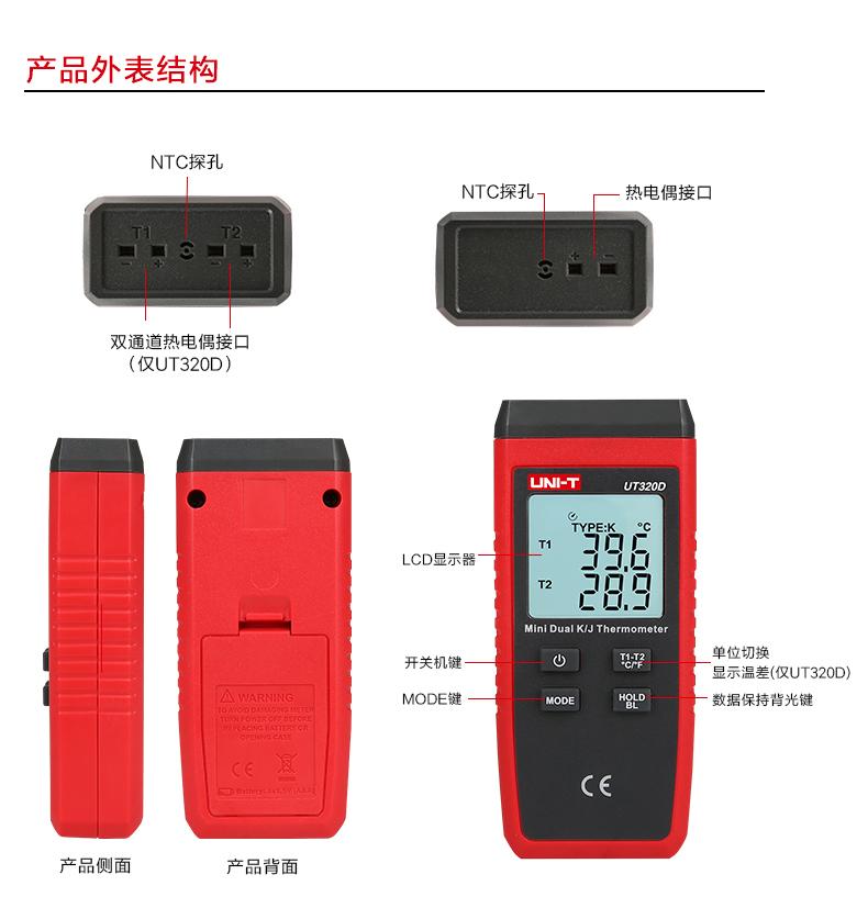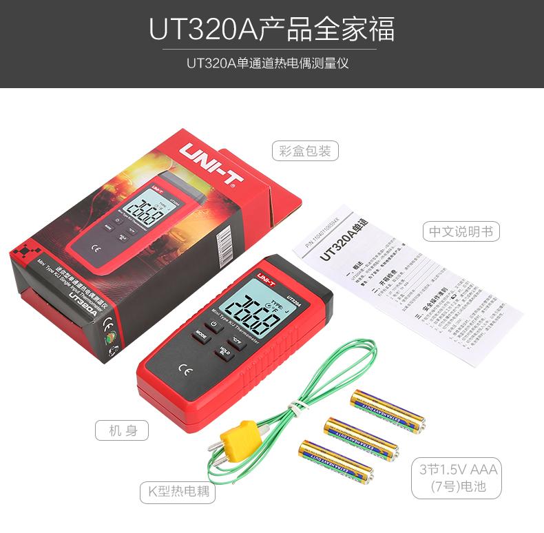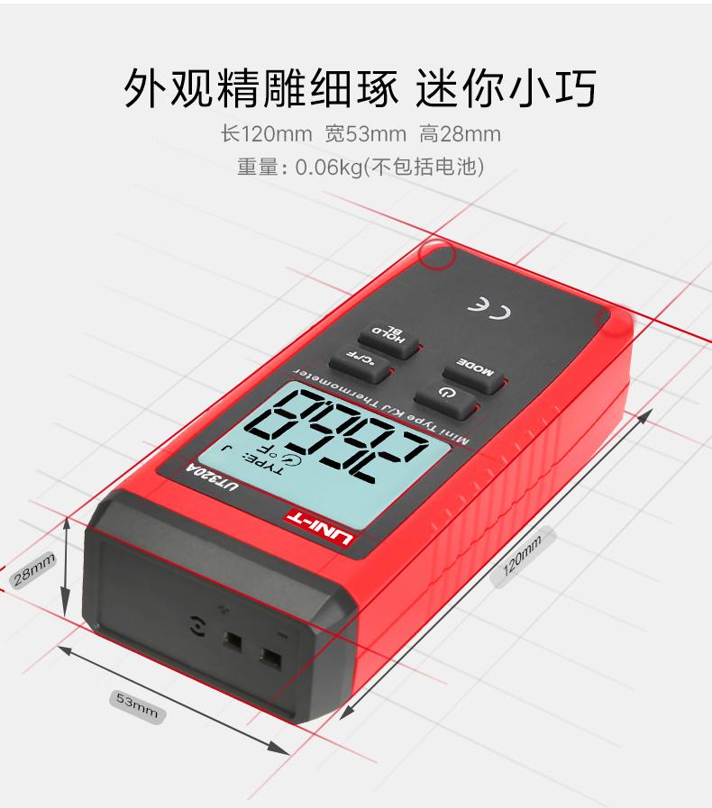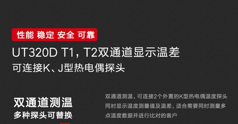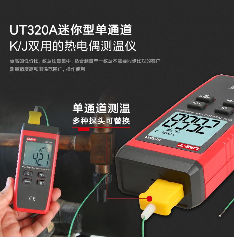 UT320A é um mini medidor de temperatura de termopar K/J de canal único e uso duplo. O produto usa um chip de operação ADC de alto bit para amostrar, amplificar e converter AD os sinais de temperatura e tensão do termopar, garantindo uma ampla faixa de medição de temperatura e alta precisão de medição, e pode ser arbitrariamente combinado com sondas de termopar K/J.