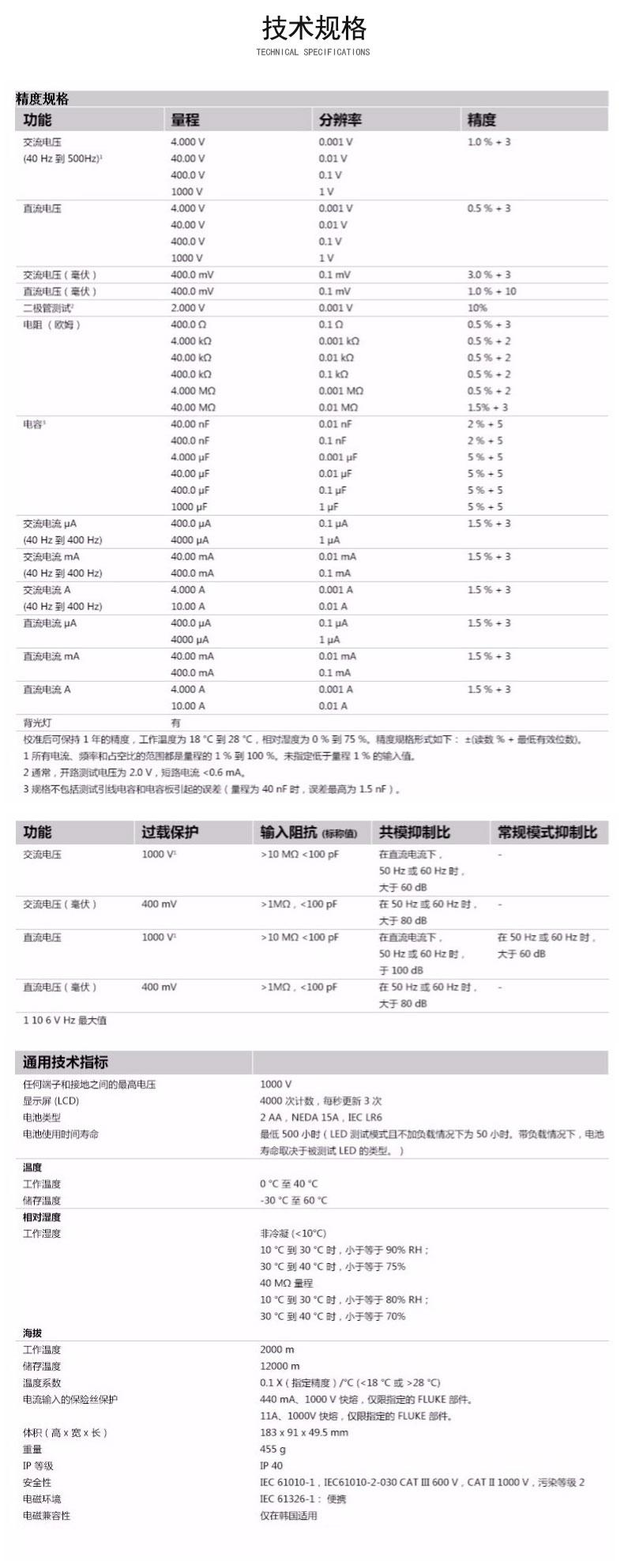 | Voltagem de corrente contínua | 1000V¹ | >10 MΩ em corrente CC, >60 dB a 50 Hz ou 60 Hz | ||