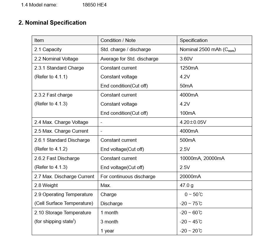 Padrão de carga e descarga: mais de 1000 vezes, tensão de corte de carga 4,2 V, tensão de corte de descarga 2,5 V