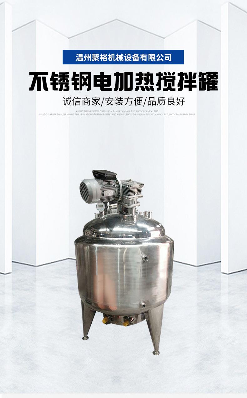 Tanque de mezcla calentado eléctricamenteusar: El tanque agitador con calentamiento eléctrico ofrece resistencia a altas temperaturas, es apto para la dosificación continua, tiene una gran capacidad de producción y no requiere calentamiento con vapor. Se utiliza ampliamente en sectores industriales como la medicina, las bebidas, la química, las resinas y la investigación científica. estructura: Español Está compuesto de cuerpo de olla, tapa de olla, agitador, camisa de calentamiento, dispositivo de soporte y transmisión, dispositivo de sellado del eje, etc. Está compuesto de cuerpo de olla, tapa de olla, agitador, sellado del eje, dispositivo de calentamiento eléctrico, etc. Hecho de acero inoxidable. El cuerpo de la olla está conectado con la tapa de la olla, hay un orificio de descarga en la parte inferior del cuerpo de la olla, hay un agitador en el tanque de calentamiento y hay orificios para tuberías de proceso, como alimentación y medición de temperatura, en la tapa de la olla. El reductor y el motor están instalados en el soporte de soldadura en la parte superior de la tapa de la olla, y el agitador en la olla es impulsado por el eje de transmisión. El dispositivo de sellado del eje está en la parte superior de la tapa de la olla. La camisa de calentamiento está provista de entrada y salida de aceite, puerto de ventilación, varilla de calentamiento eléctrica y otros orificios para tuberías.