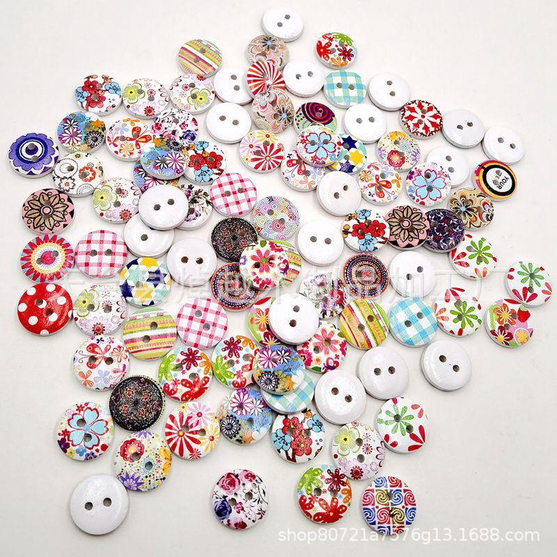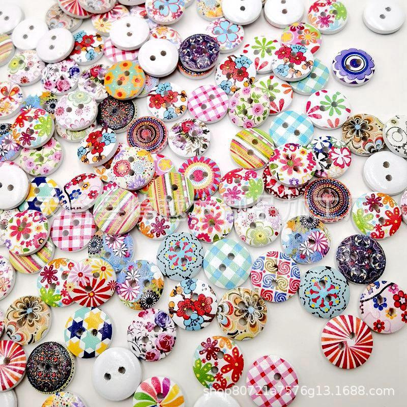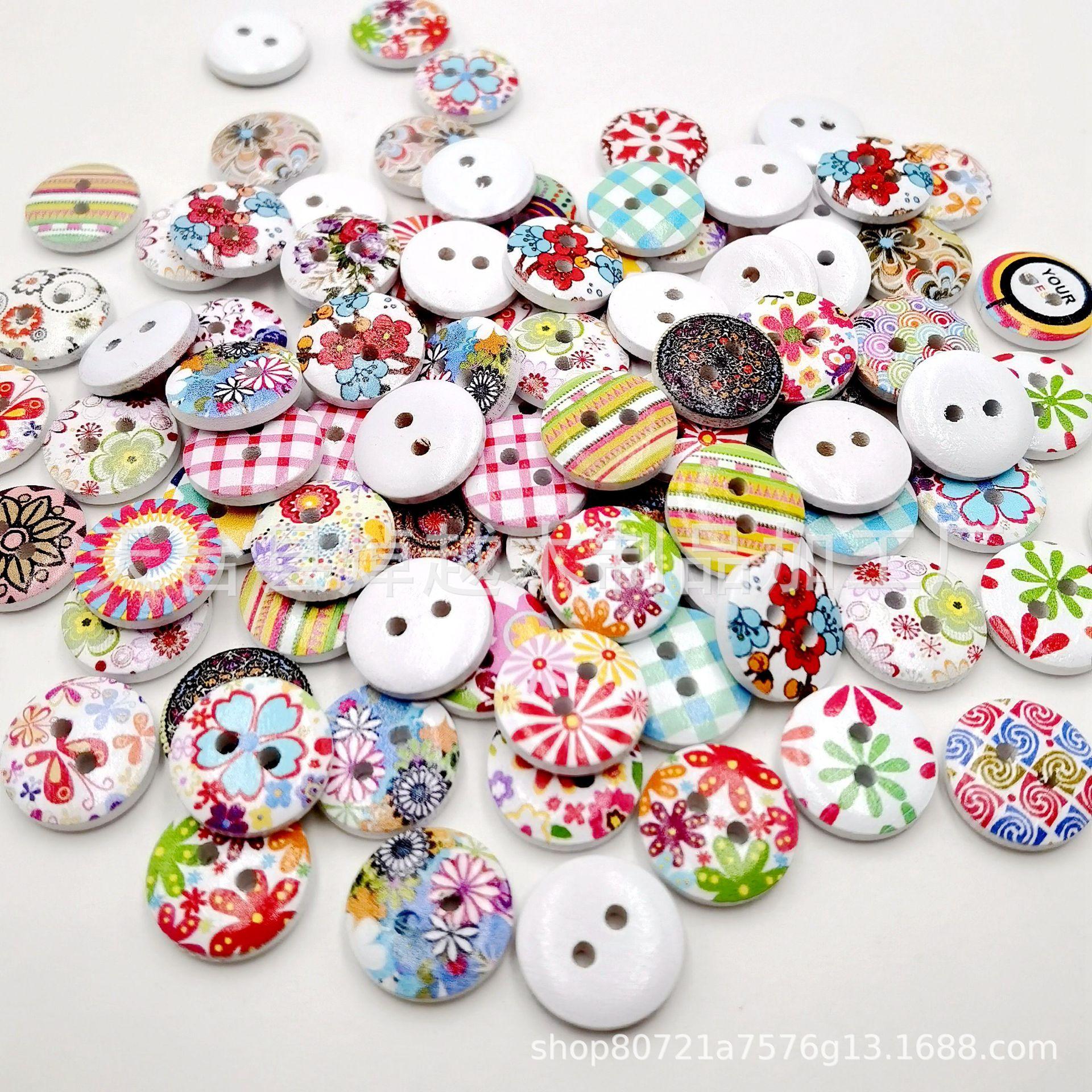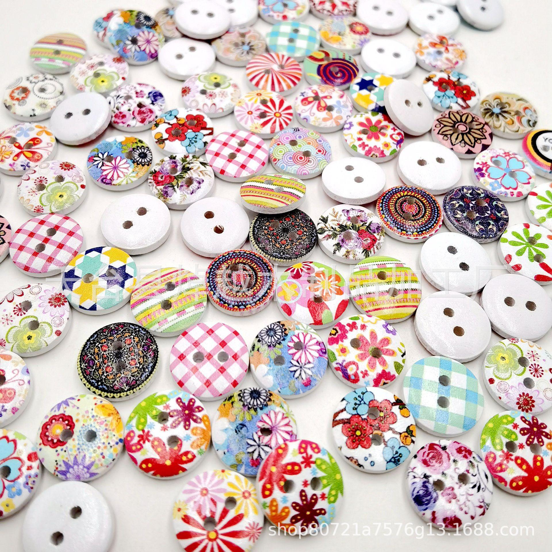 Material:Botões redondos de madeira maciça com fundo branco e impressão colorida, grandes quantidades em estoque