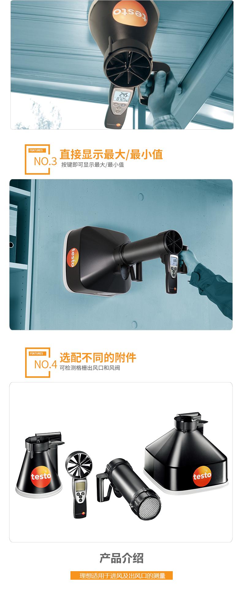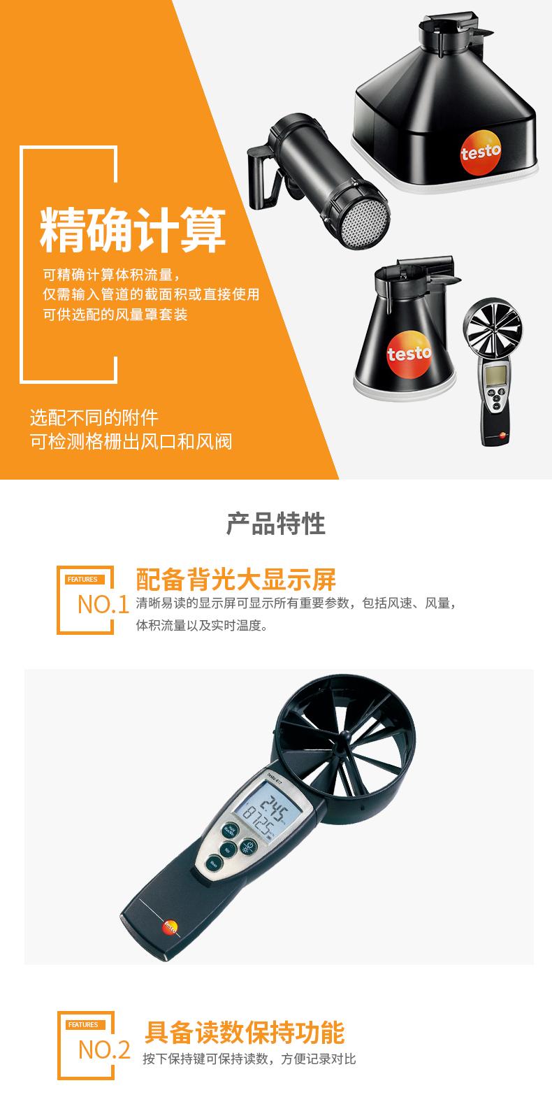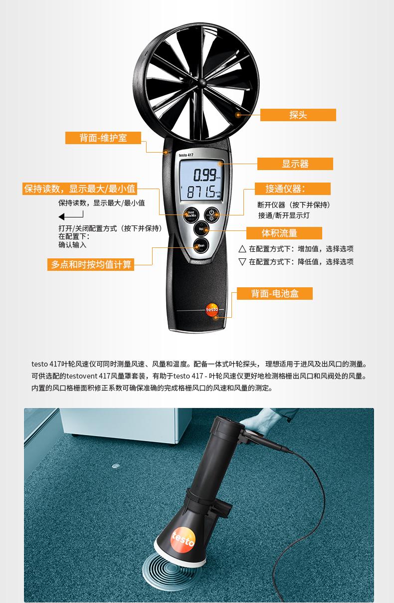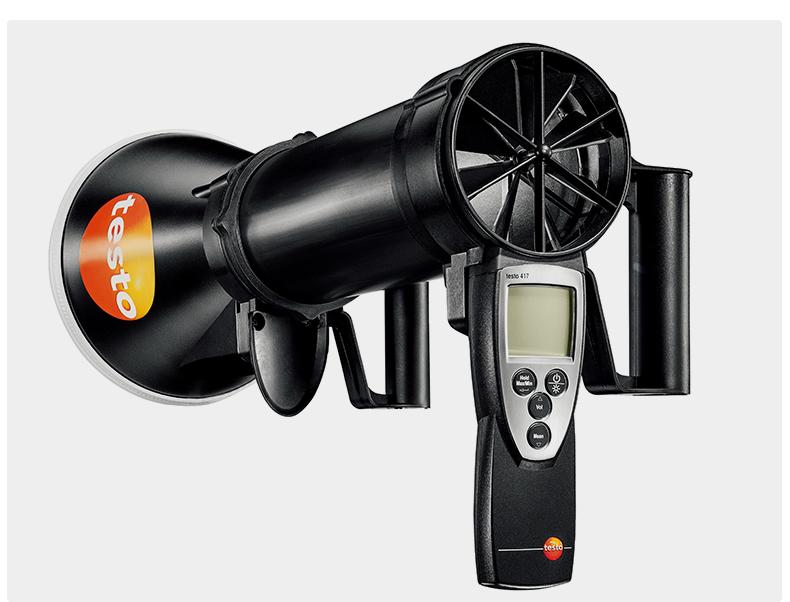 El anemómetro de precisión testo 417 está equipado con una sonda de velocidad del viento/temperatura integrada con un diámetro de 100 mm para medir la velocidad del viento, el volumen de aire y la temperatura.