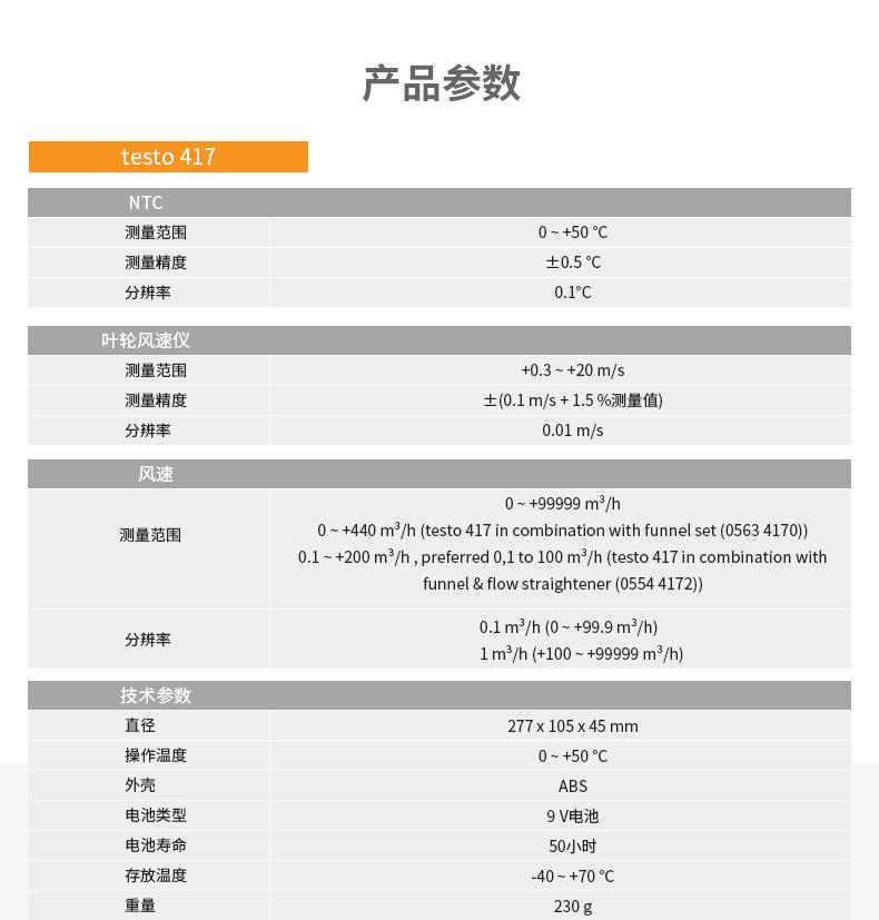 0 ~ +99999 m³/h 0 ~ +440 m³/h (testo 417 en combinación con el juego de embudos (0563 4170)) 0,1 ~ +200 m³/h, preferiblemente de 0,1 a 100 m³/h (testo 417 en combinación con embudo y enderezador de flujo (0554 4172)) |