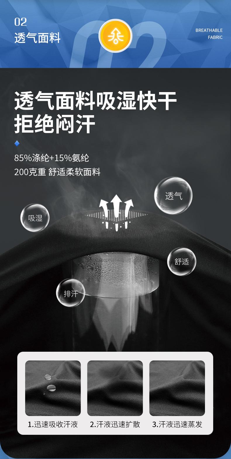 1. O tecido é feito de tecido elástico esportivo de malha com trama de 85% poliéster e 15% elastano, contendo ingredientes de Lycra: respirável, absorvente de umidade e boa solidez da cor.